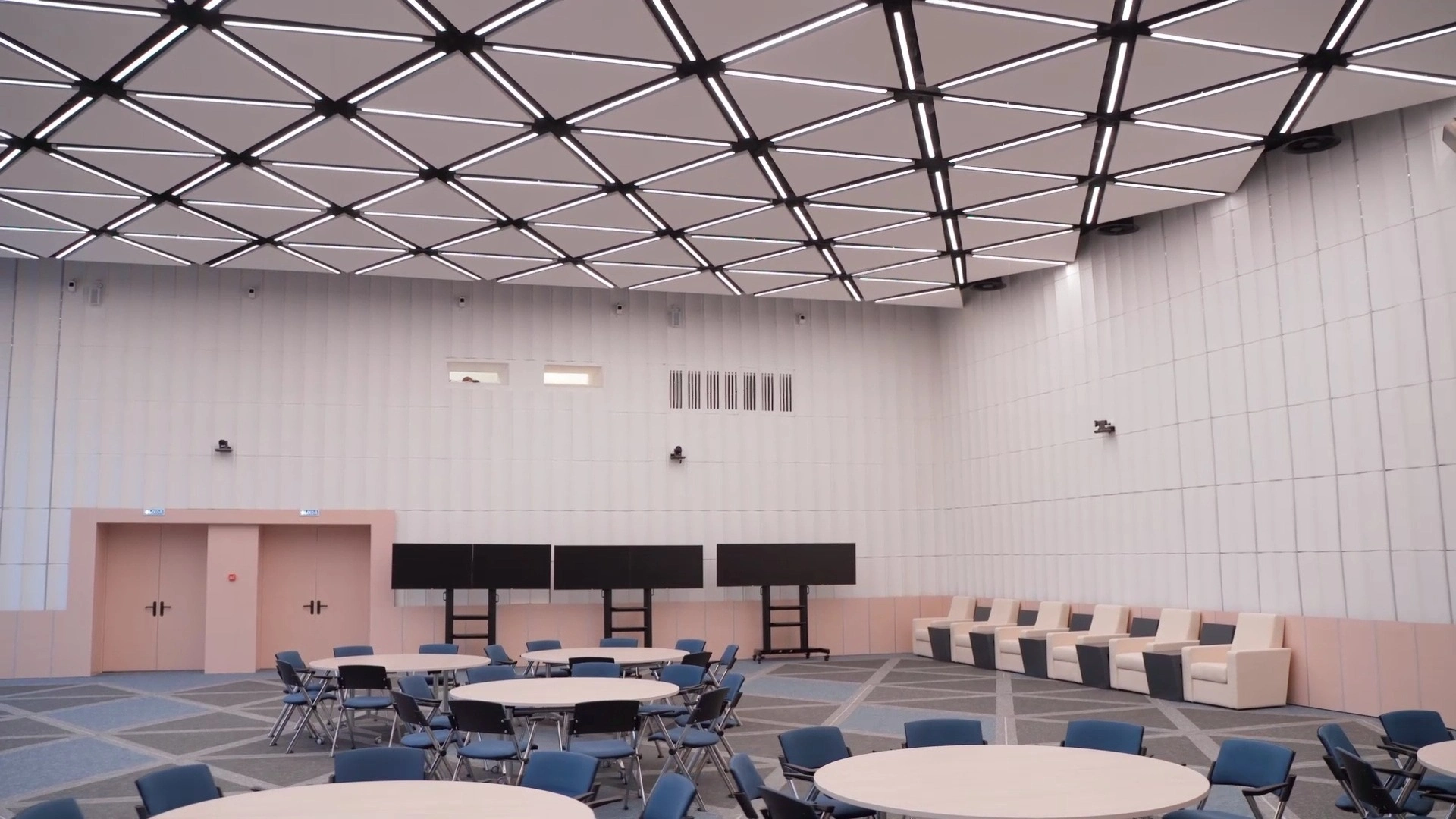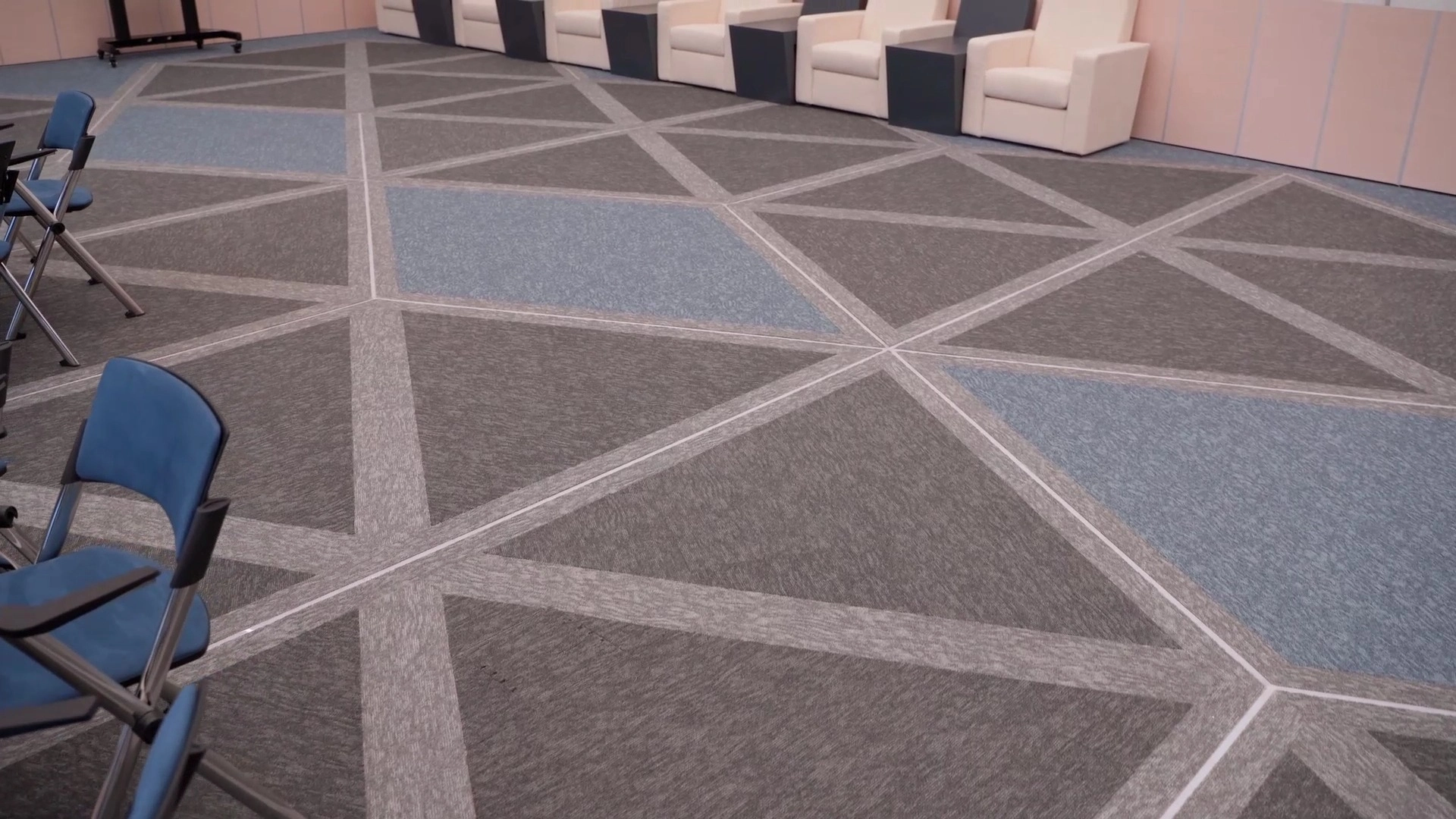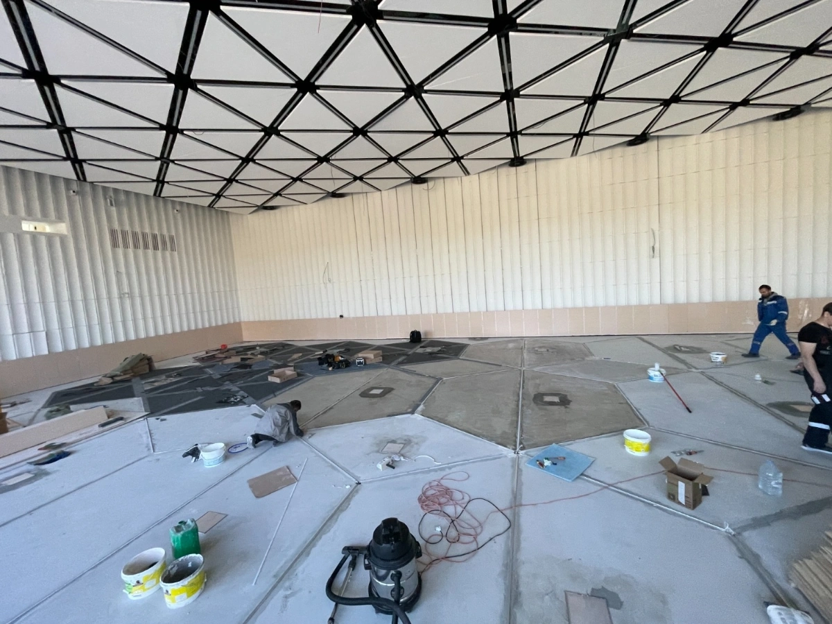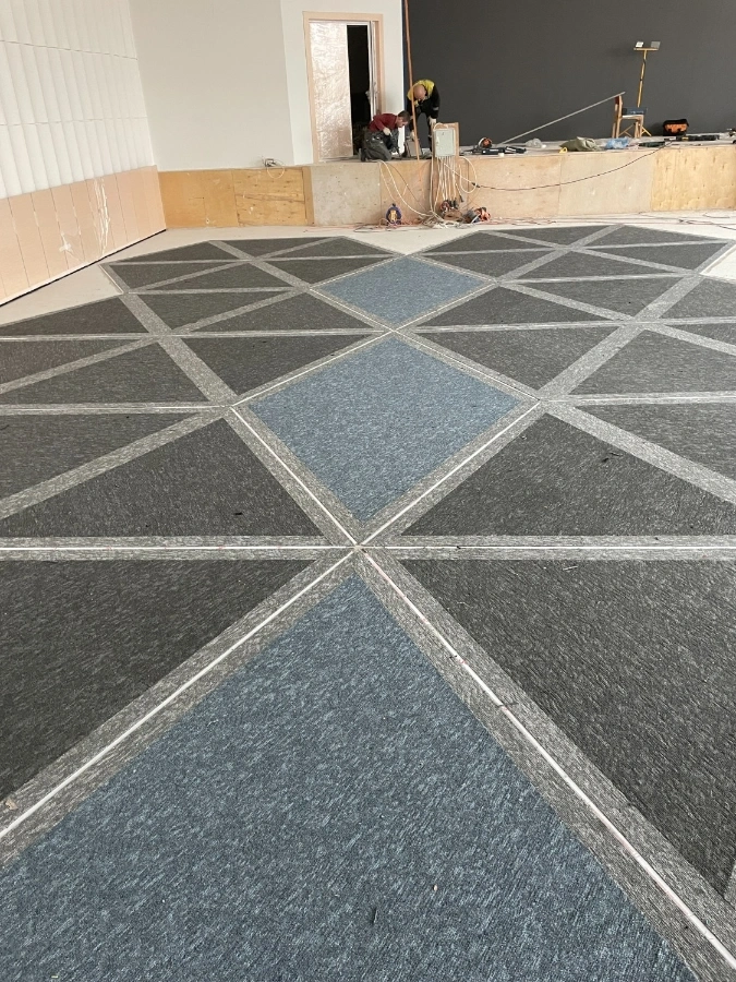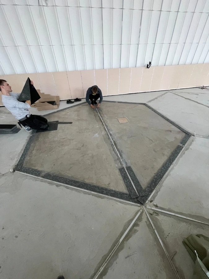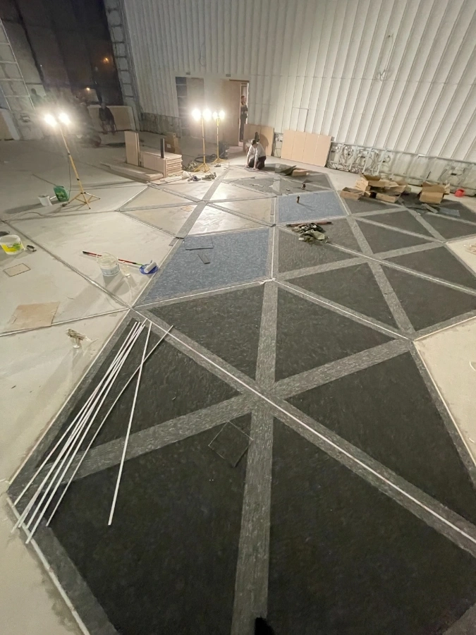 Результатом работы является красивое и эстетически приятное покрытие пола, которое гармонично сочетается с назначением объекта. Укладка ковровой плитки в виде шестигранников (сот реактора) придает помещению уникальный и стильный вид, а также обеспечивает комфорт и удобство при использовании. Светодиодная подсветка создает неповторимые ощущения.