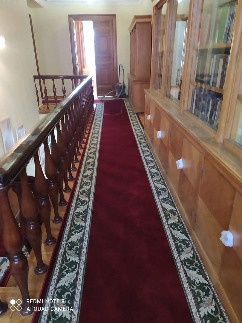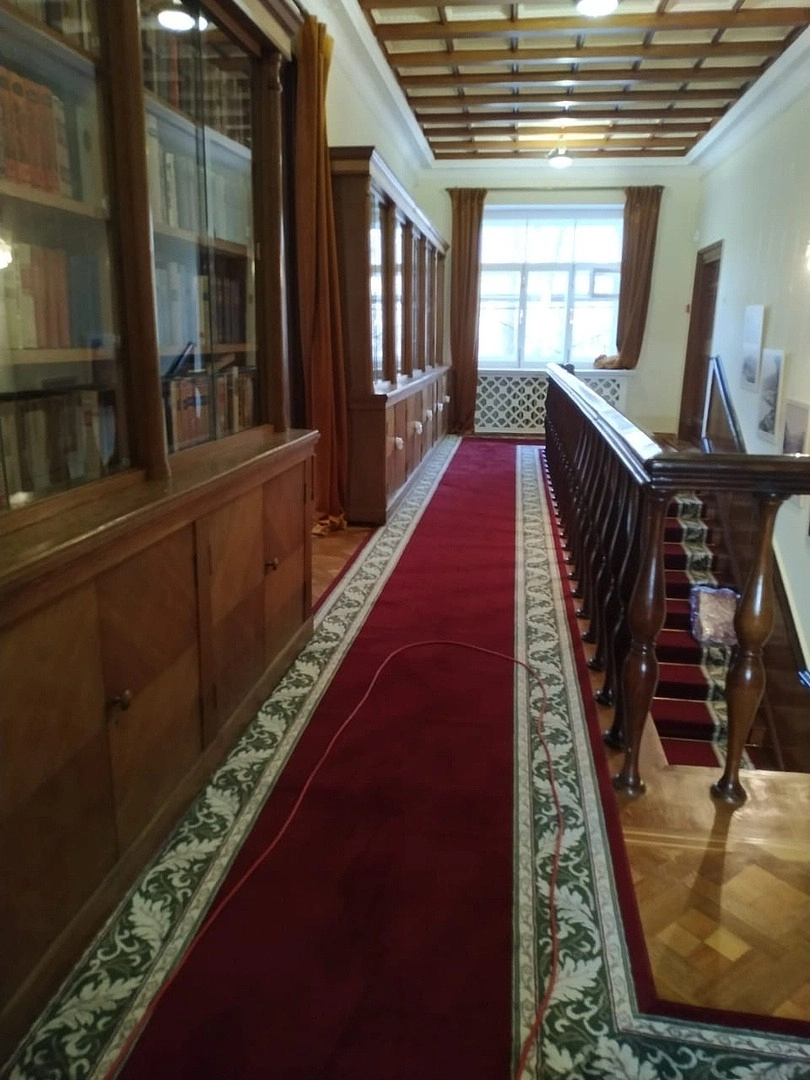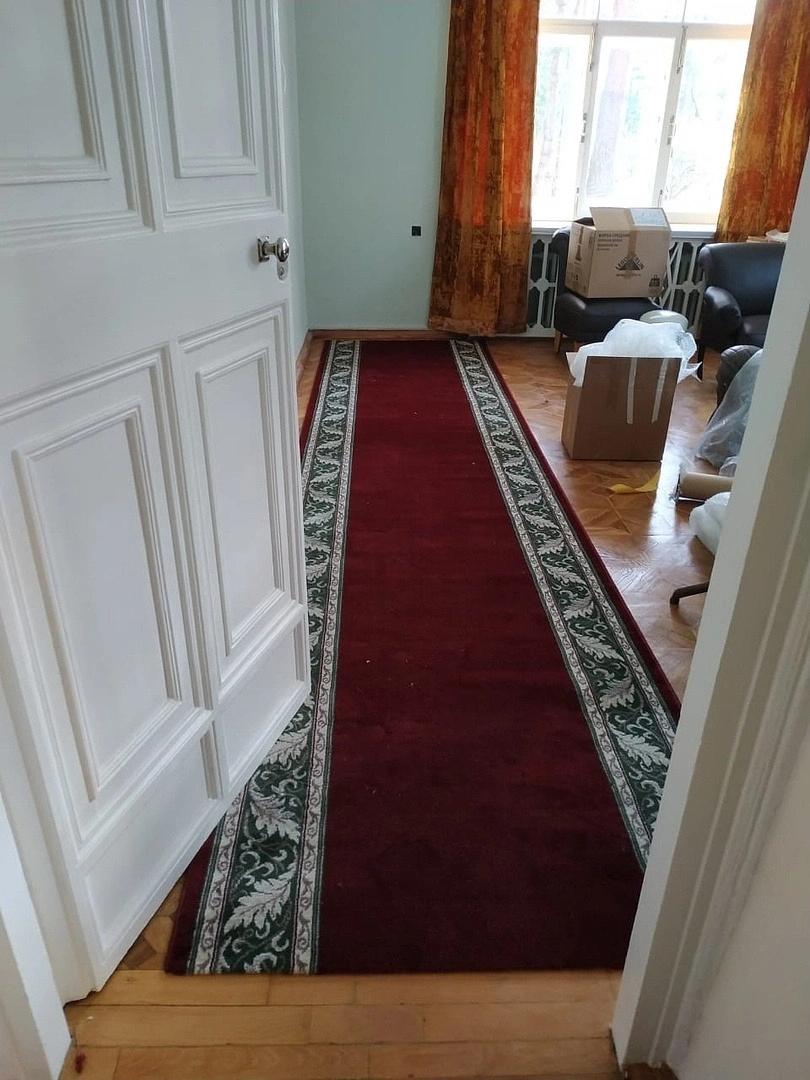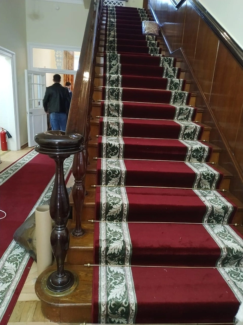 Постелили на лестницу кремлёвскую дорожку с поворотами. Повороты выполнены при помощи спайки . Укладка на скотч. Установили ковродержатели и на месте сделали оверлок края.