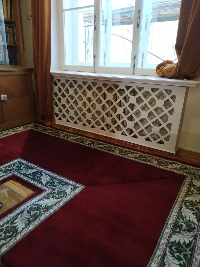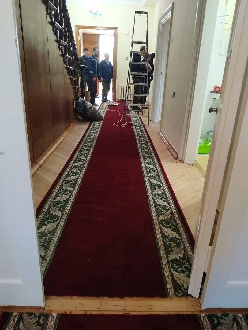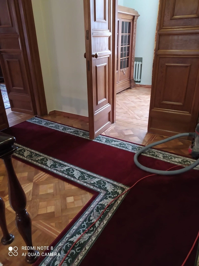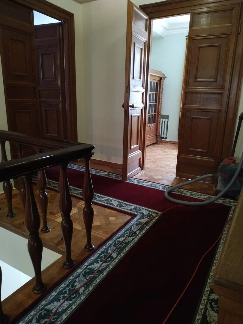 Постелили на лестницу кремлёвскую дорожку с поворотами. Повороты выполнены при помощи спайки . Укладка на скотч. Установили ковродержатели и на месте сделали оверлок края.