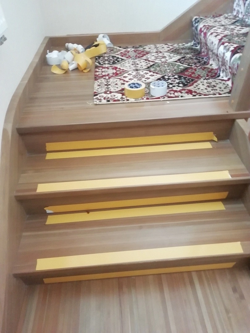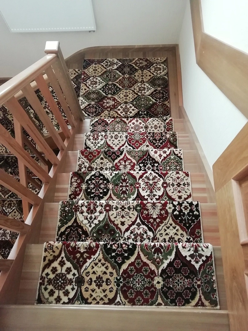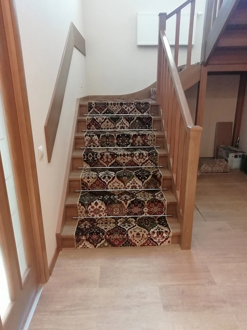 Сделали укладку дорожек на ступени.Установили ковродержатели.Оверлок на месте.