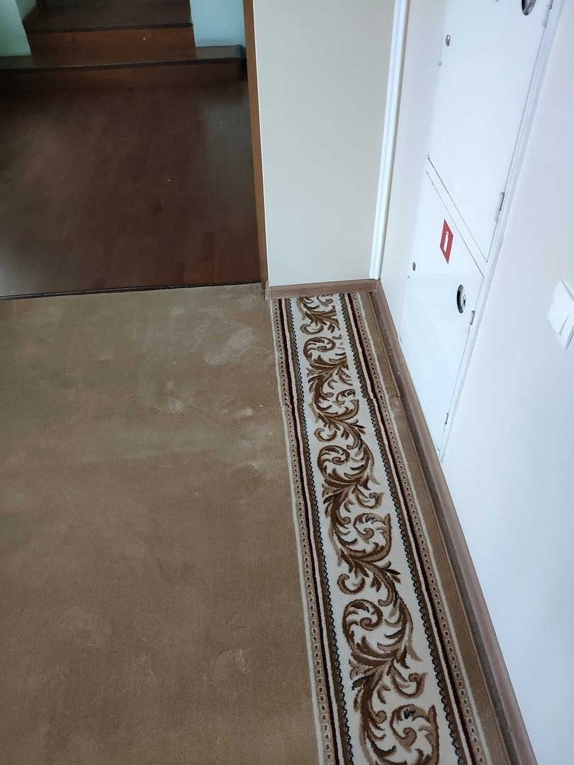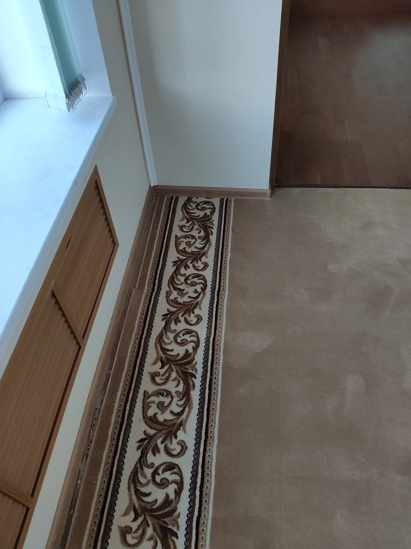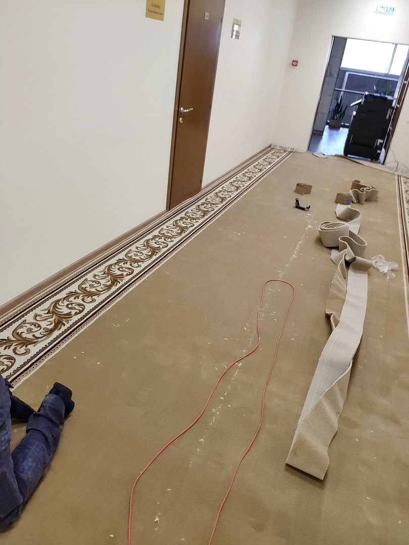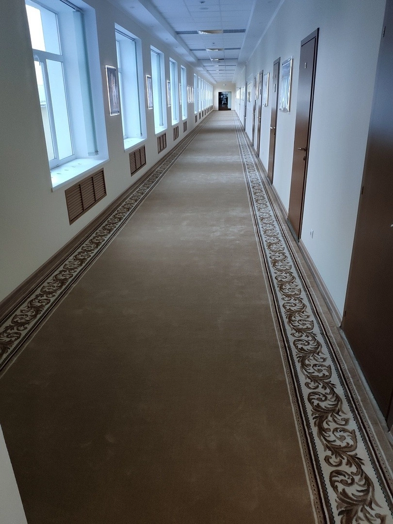 В коридоре Министерства природных ресурсов и экологии произвели укладку бежевой дорожки из износостойкого синтетического волокна. Сделали спайку швов,чтобы рисунок смотрелся естественно.