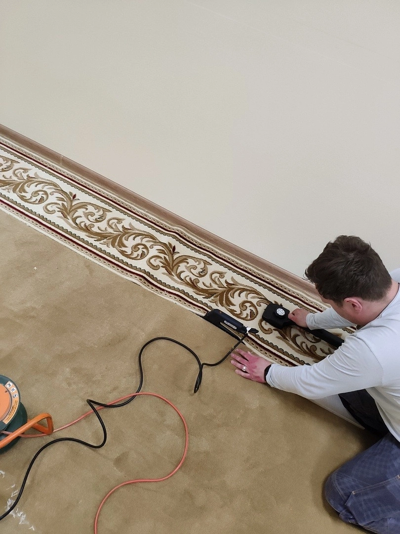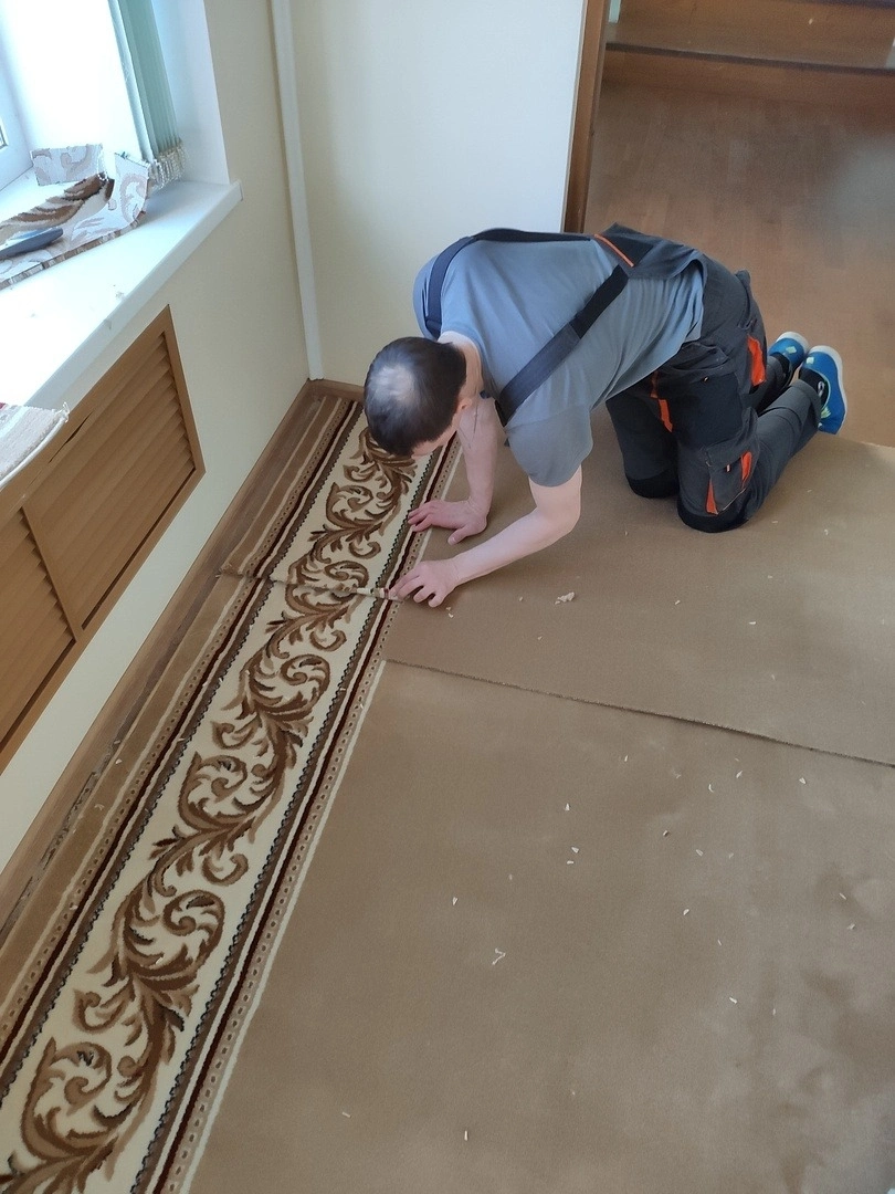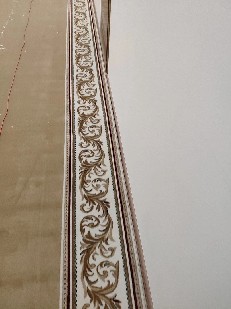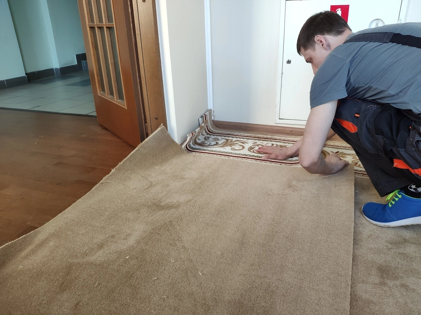 В коридоре Министерства природных ресурсов и экологии произвели укладку бежевой дорожки из износостойкого синтетического волокна. Сделали спайку швов,чтобы рисунок смотрелся естественно.