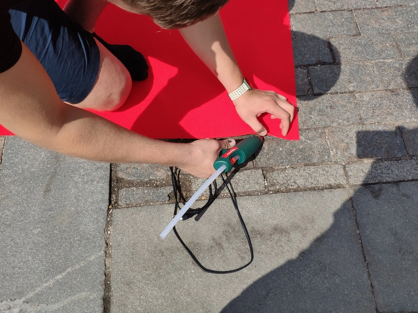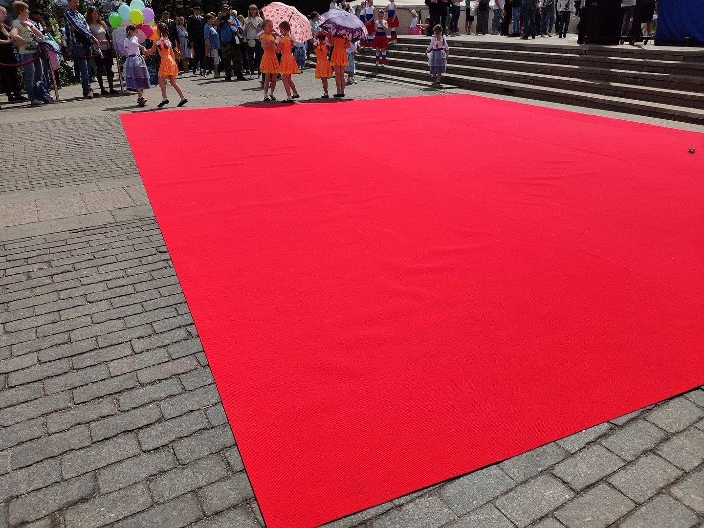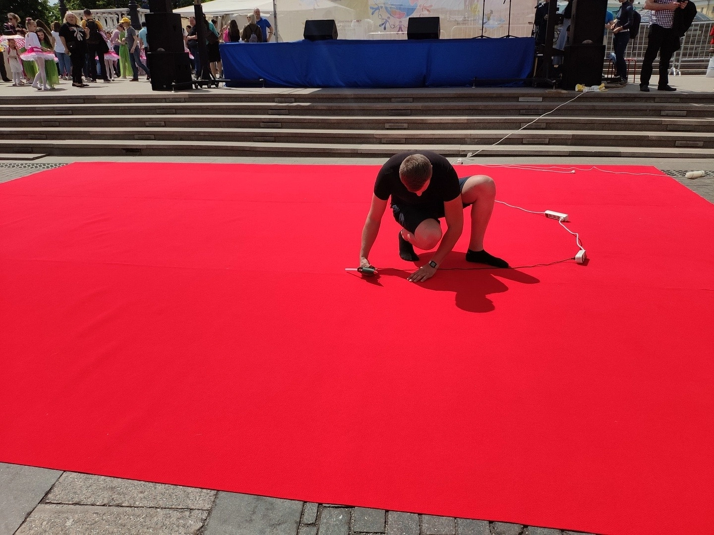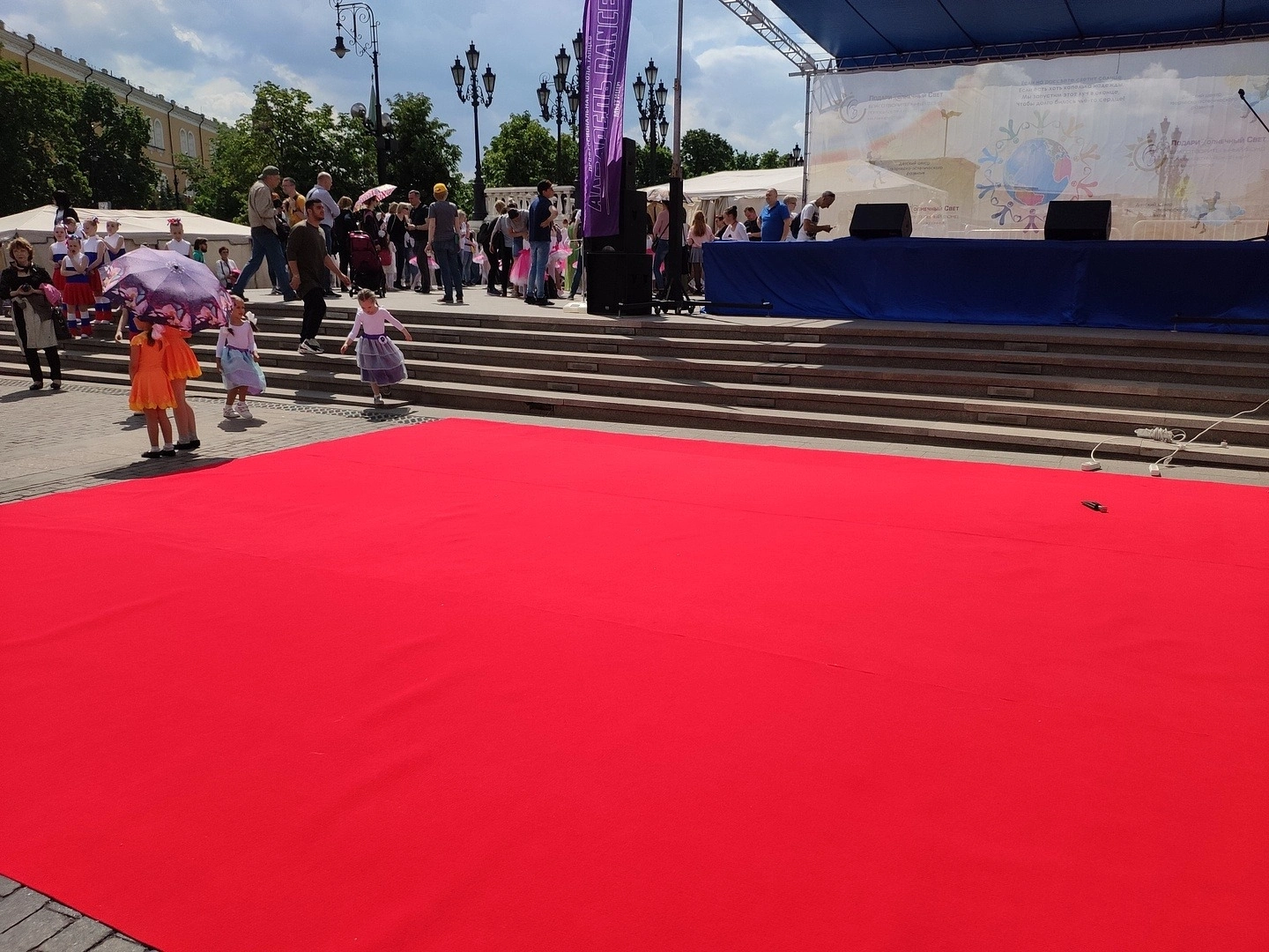 К нам обратились из Благотворительного фонда "Подари солнечный свет" с просьбой предоставить им дорожку и сделать укладку на плитку . Дорожку стелили перед сценой,для выступления.