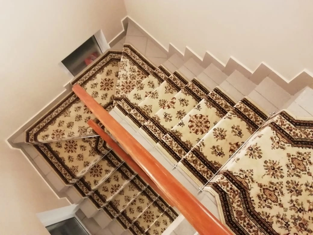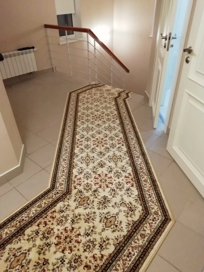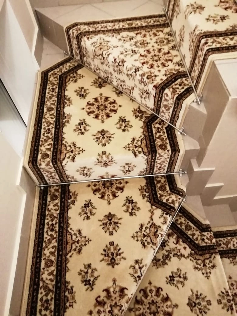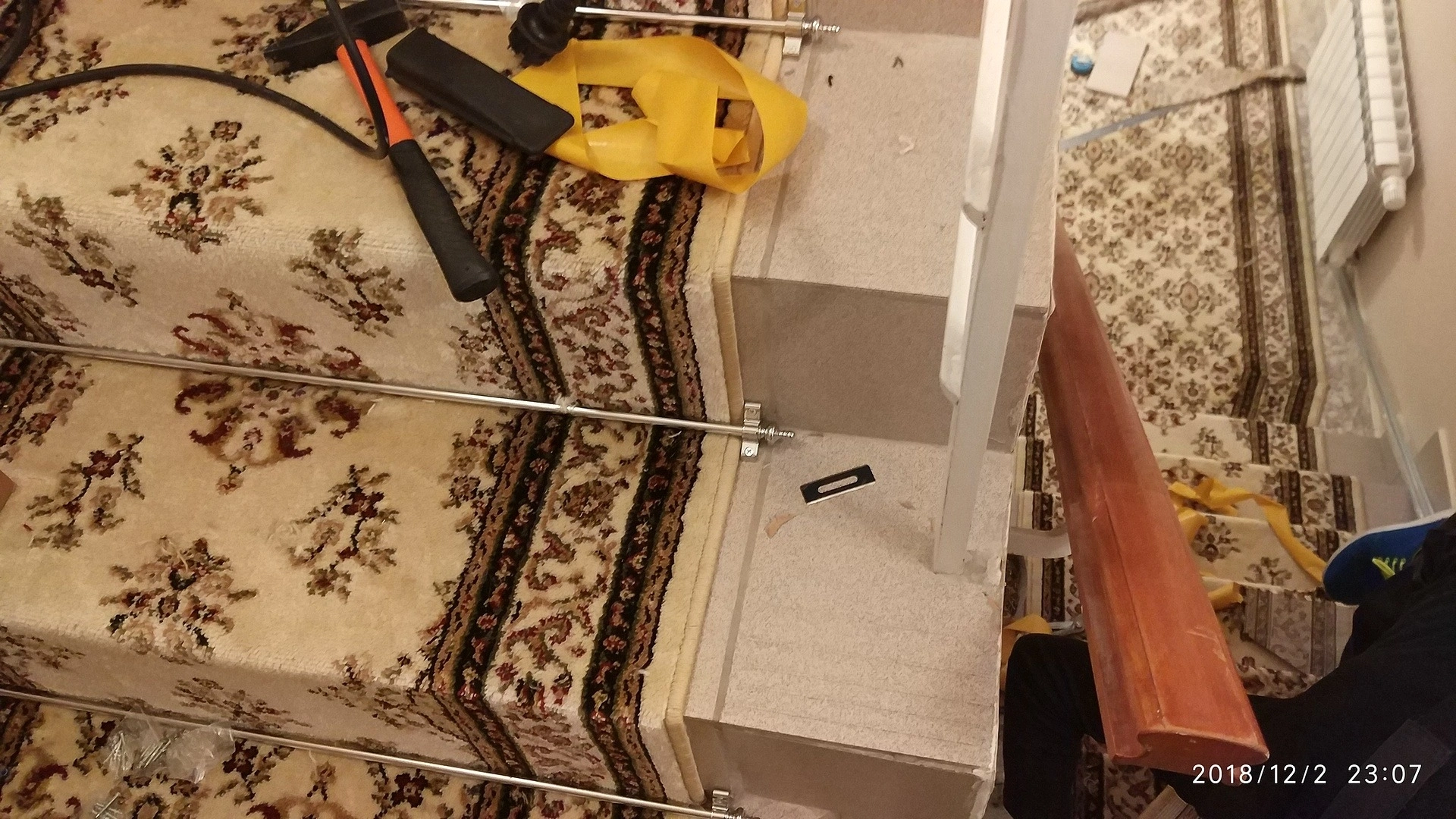 Сделали укладку дорожки на лестницу , сварку швов, установку ковродержателей