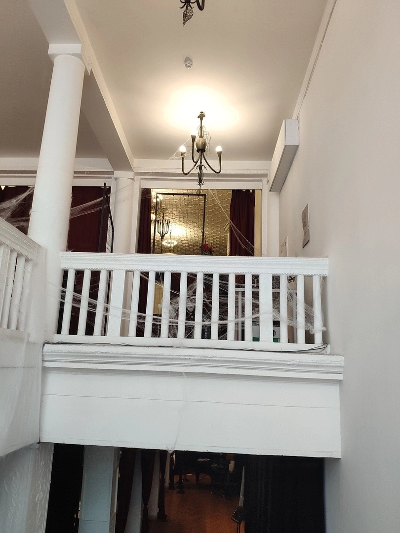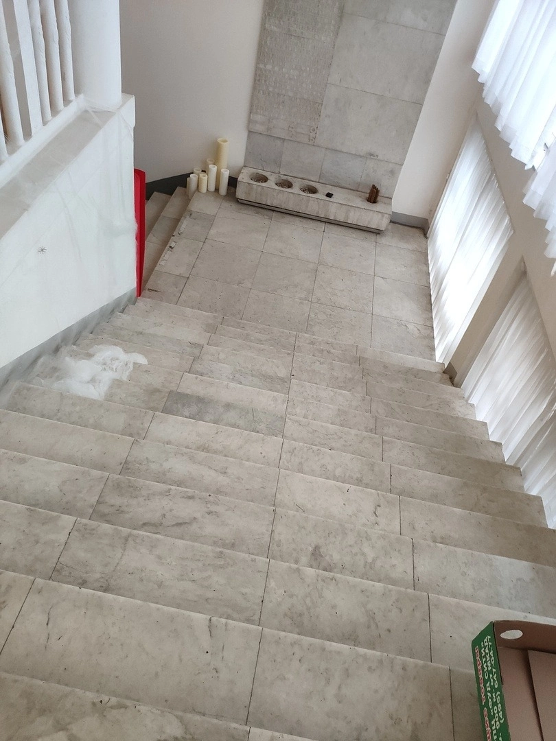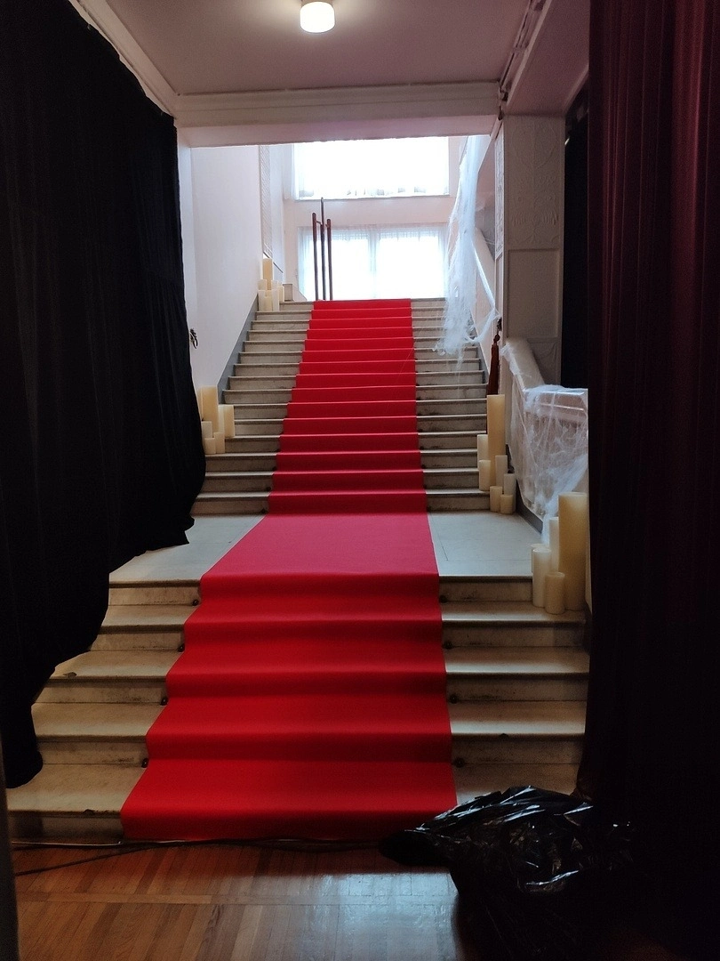 Уложили дорожку для мероприятий на лестницу. Укладку делали на двусторонний скотч.