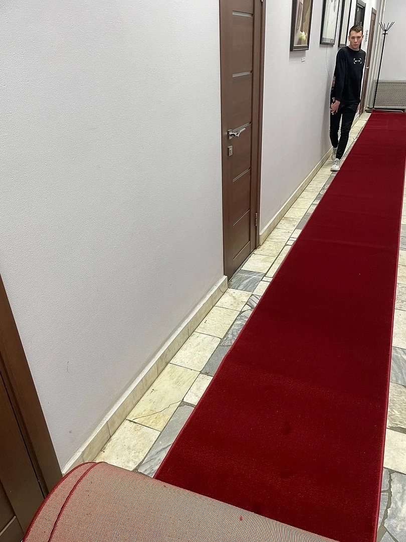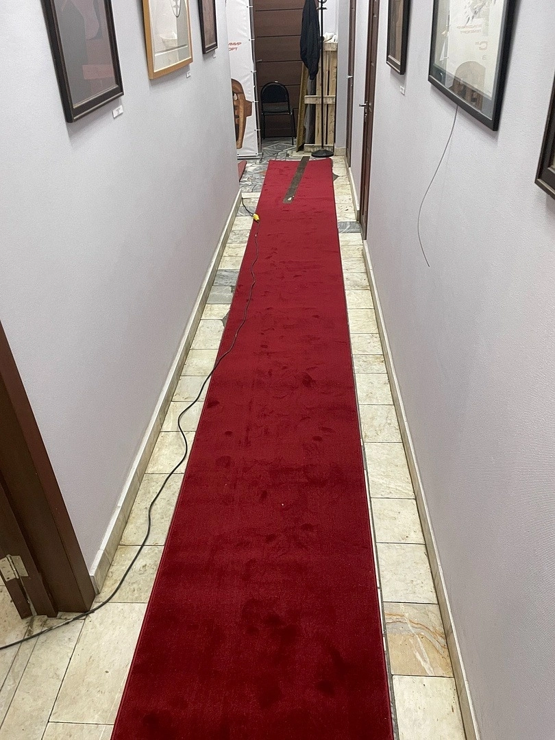 На двусторонний скотч уложили ковровую дорожку с поворотами.Вырезали по размерам,сделали спайку швов.Оверлок на месте.