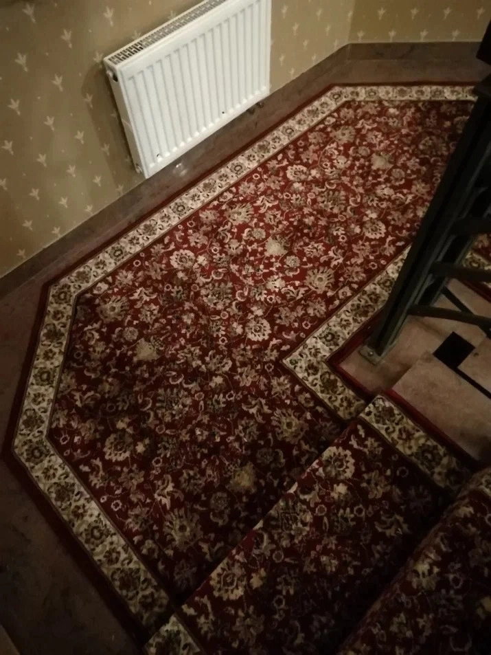 Вырезали по размерам, сделали спайку швов и уложили дорожки на лестницу с поворотами.Установили ковродержатели.