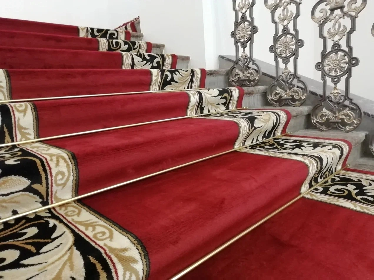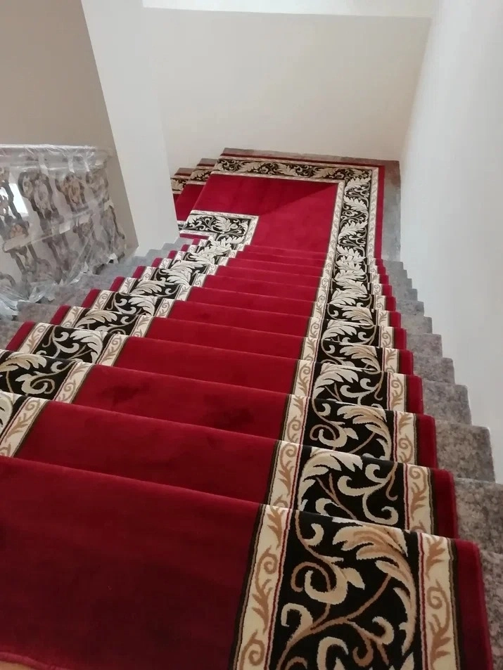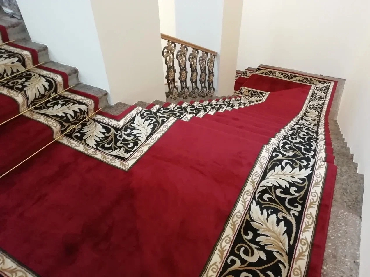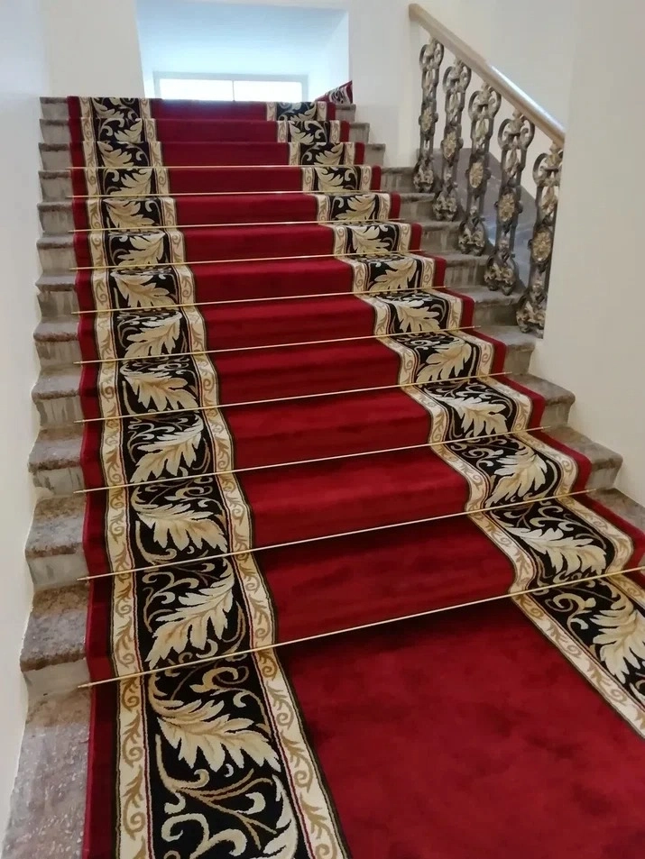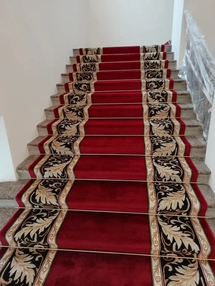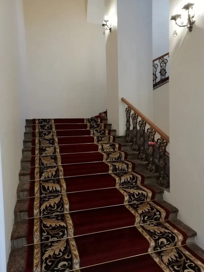 На лестницу уложили на двусторонний скотч кремлевскую дорожку из высокопрочного синтетического волокна.Сделали оверлок и установили ковродержатели.