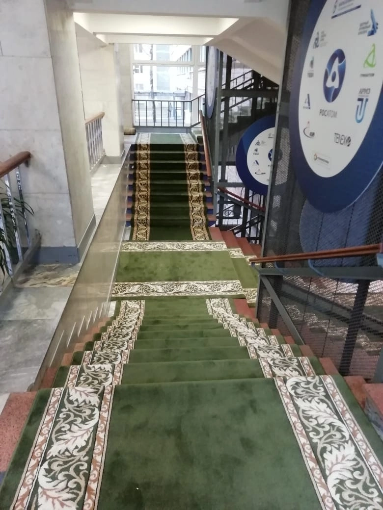 На лестницу и в холле уложили кремлевскую дорожку. Спаяли швы,сделали оверлок на месте.