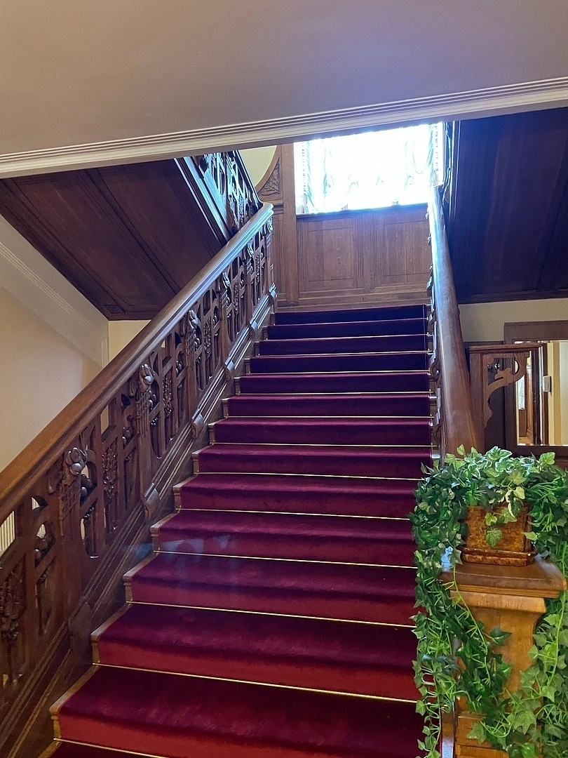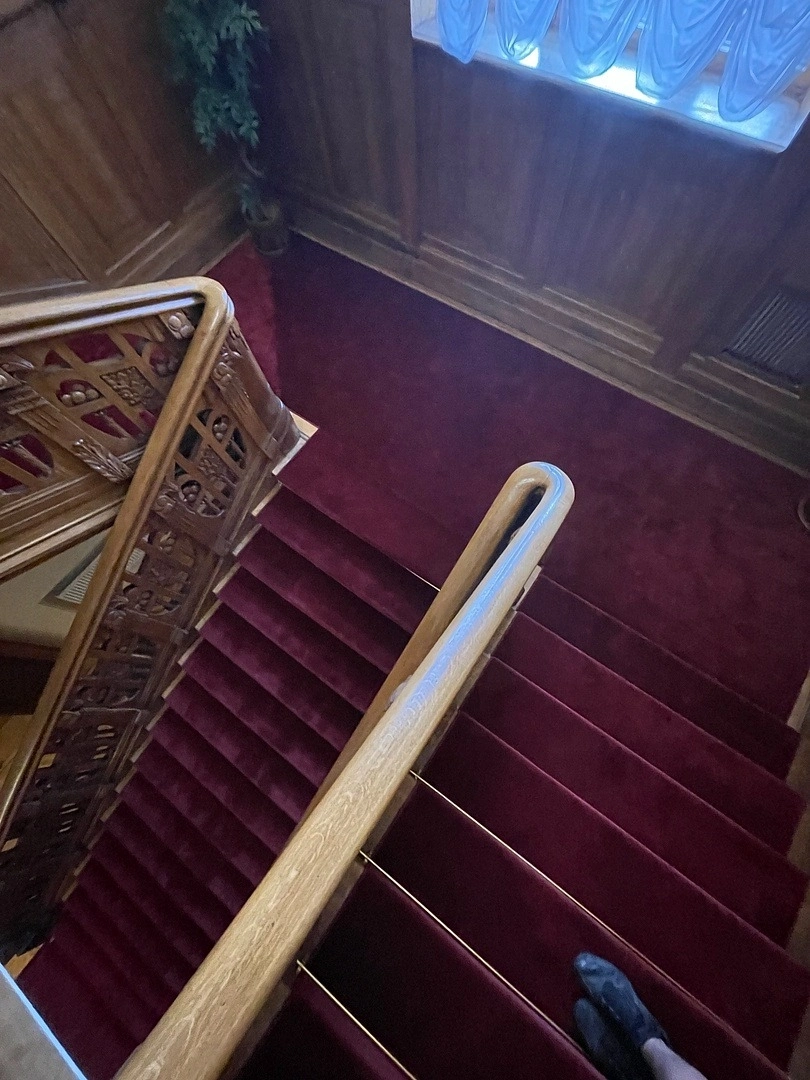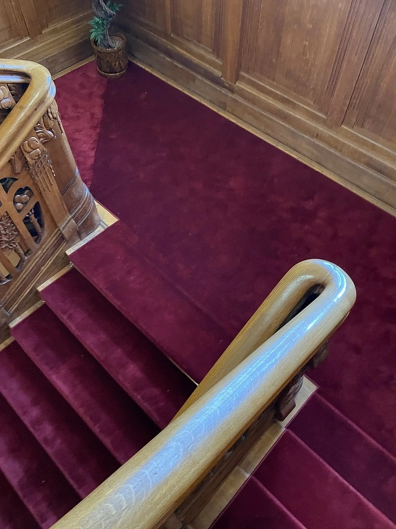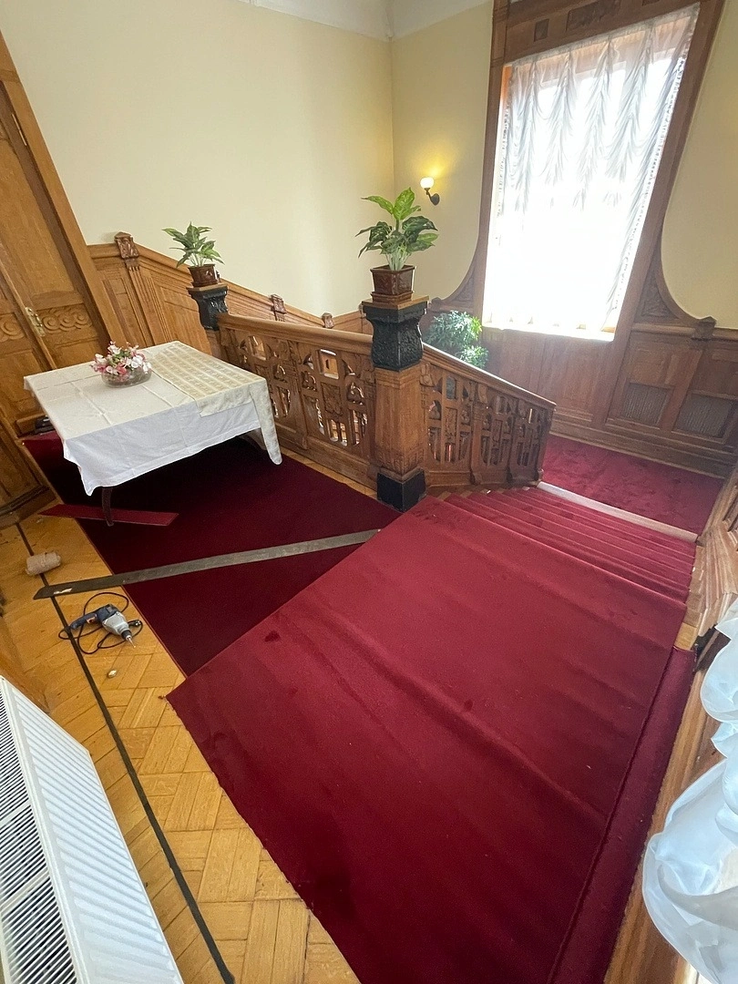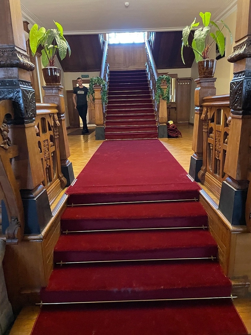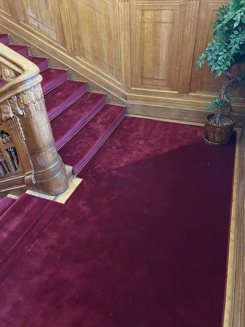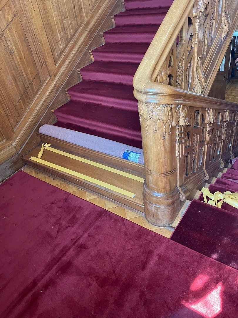 Уложили дорожку на лестницу, установили ковродержатели,сделали оверлок на месте