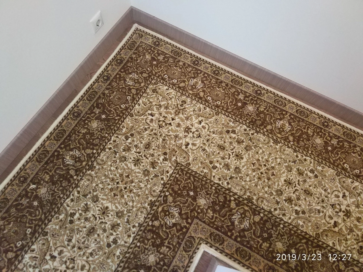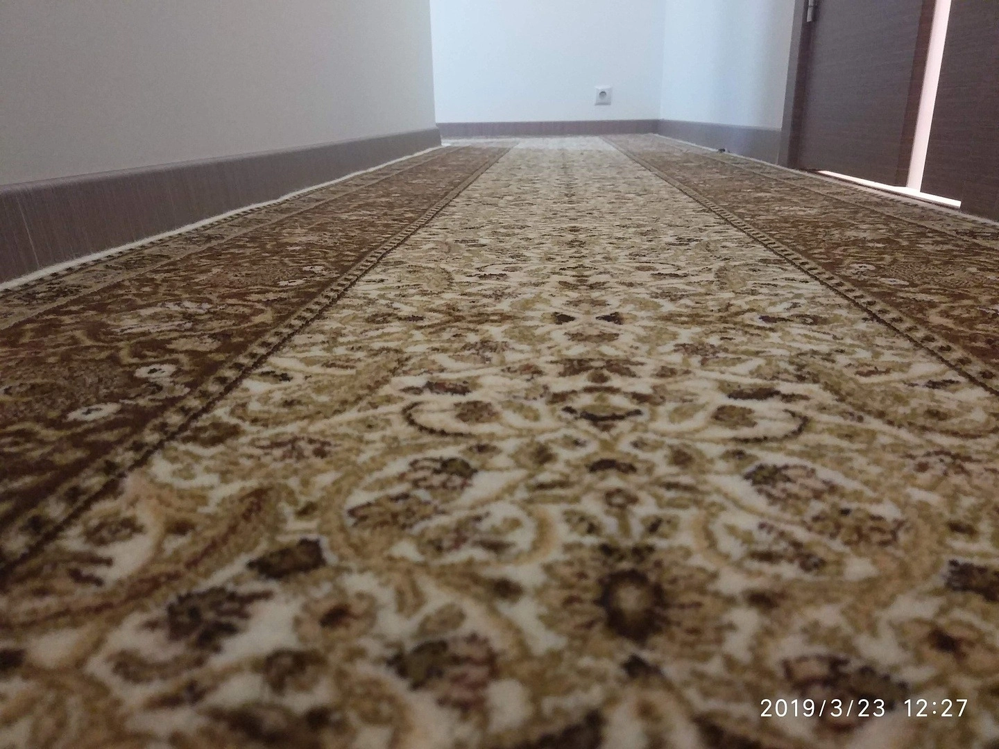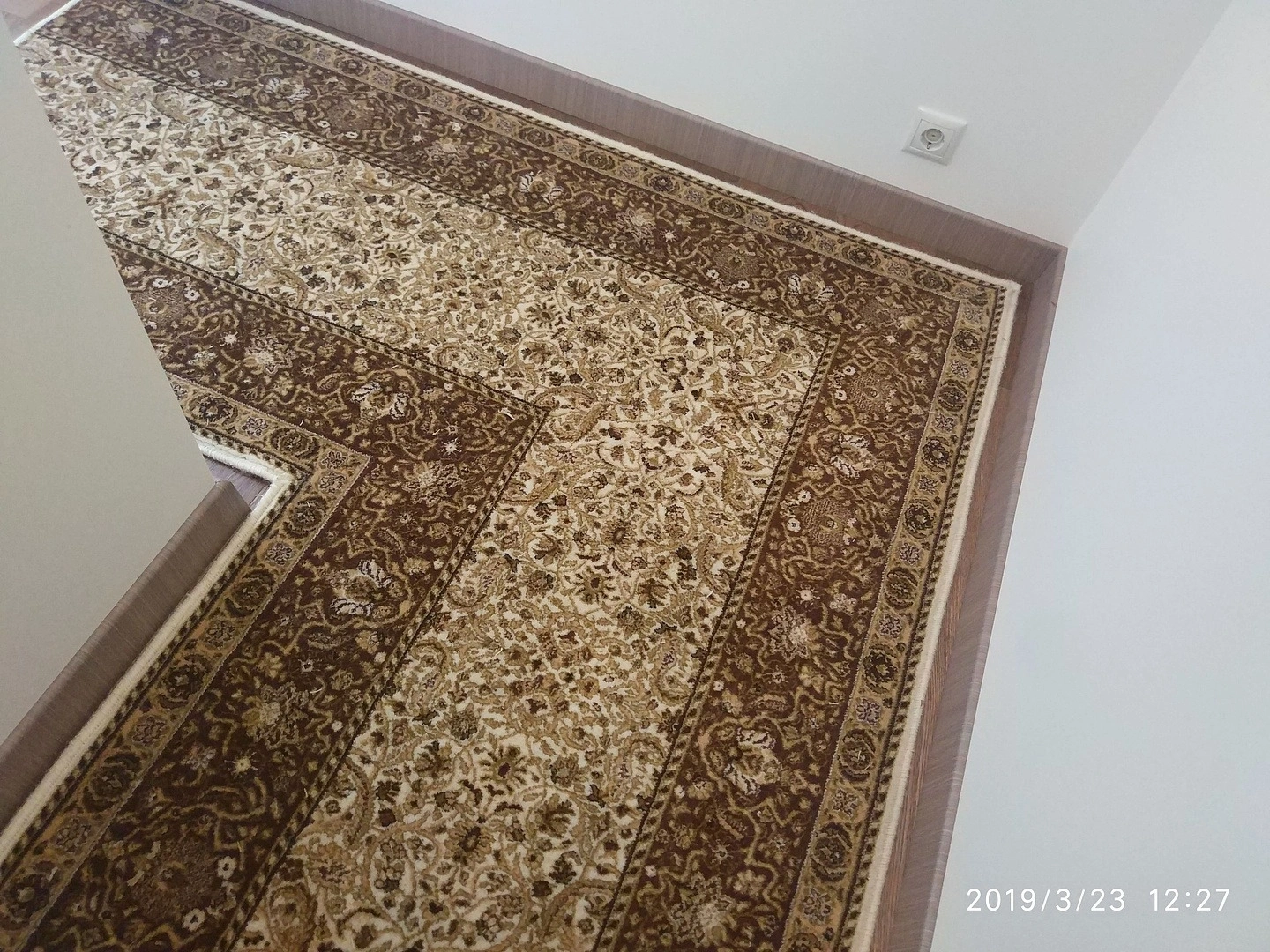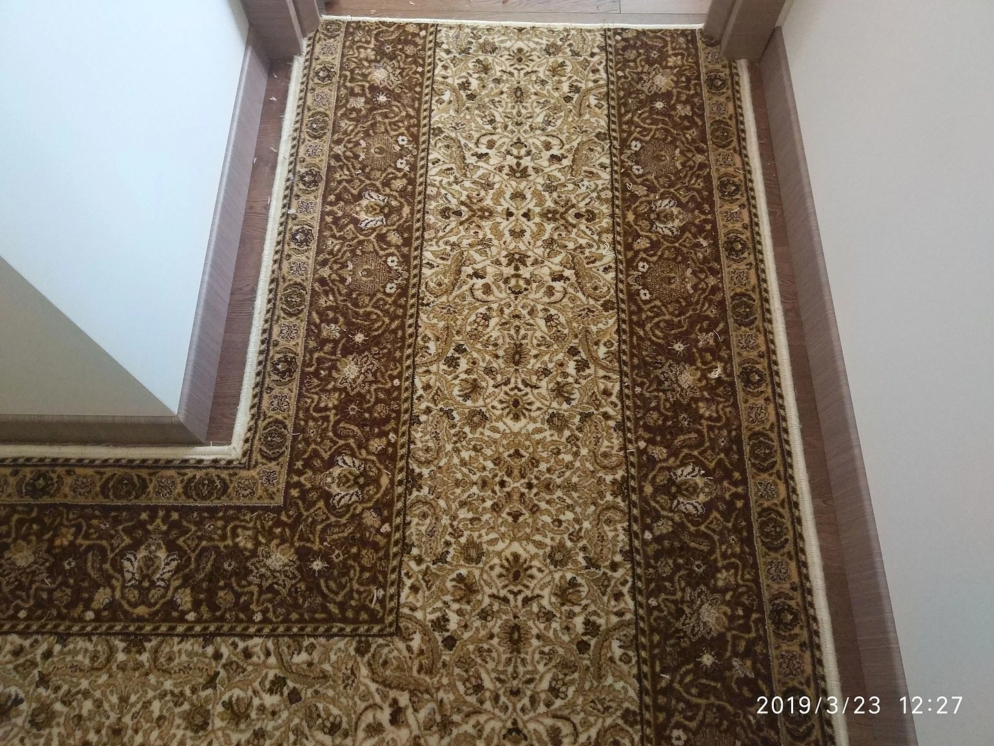 Подобрали рисунок,спаяли швы, уложили классическую шерстяную дорожку в коридоре, сделали оверлок.