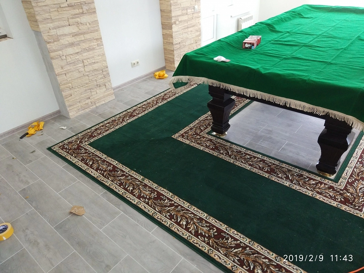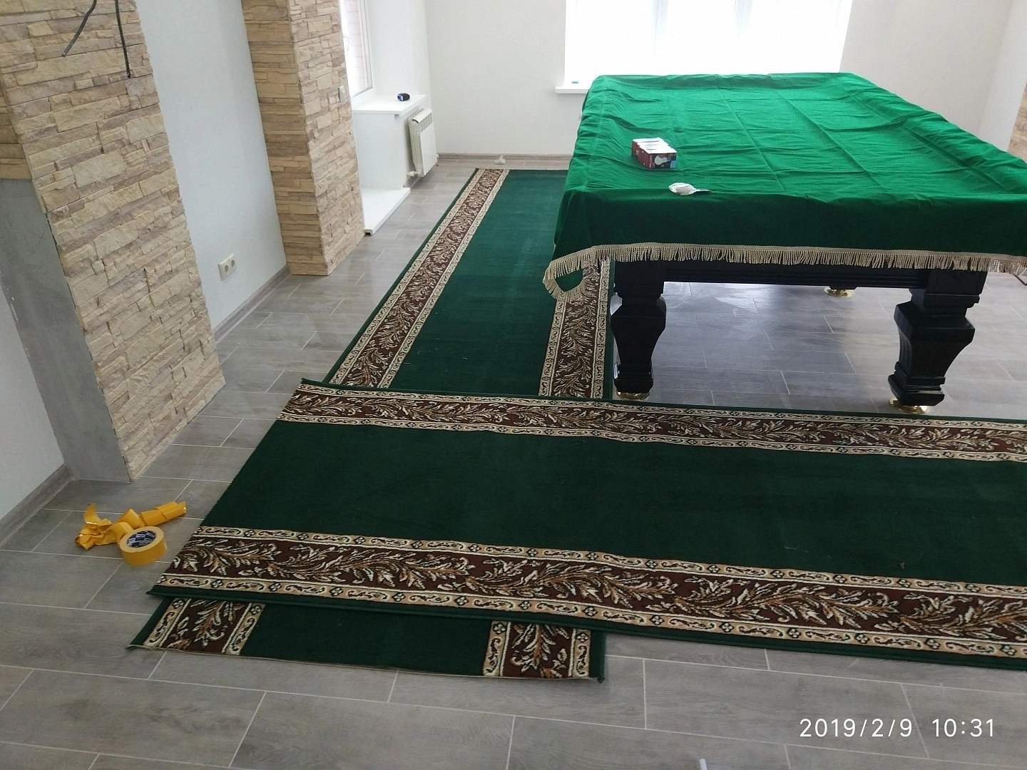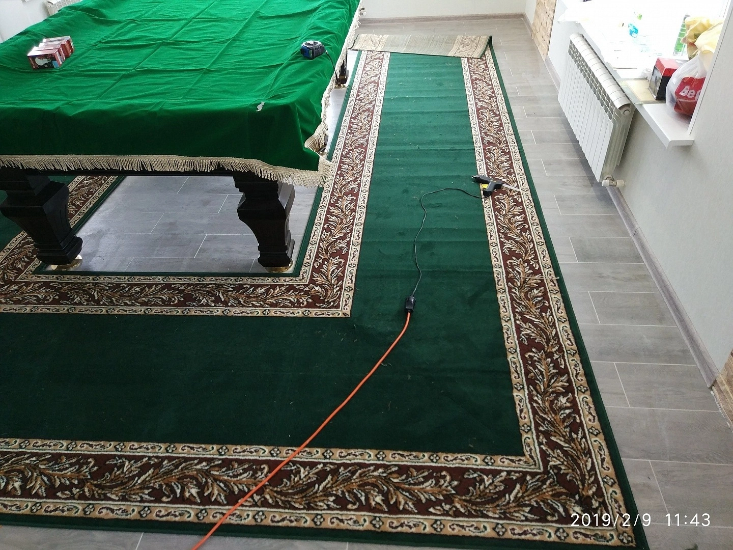 Уложили дорожку вокруг бильярдного стола. Дорожка фиксировалась на термоклей из пистолета, для того ,чтобы не оставлять следов на керамограните.Сделали оверлок.