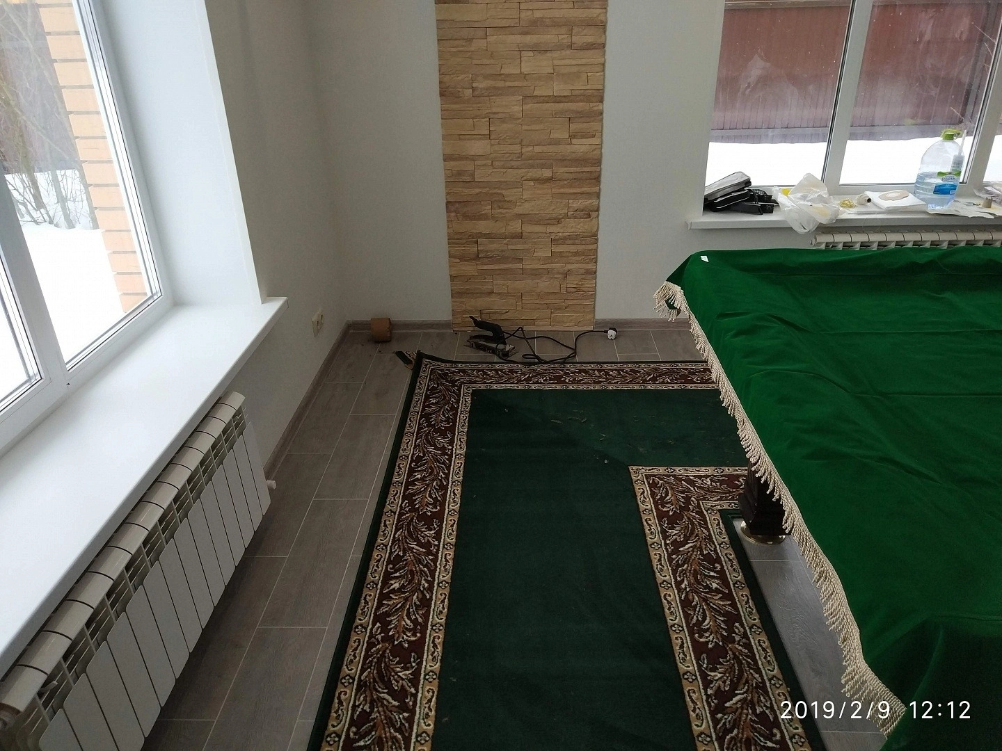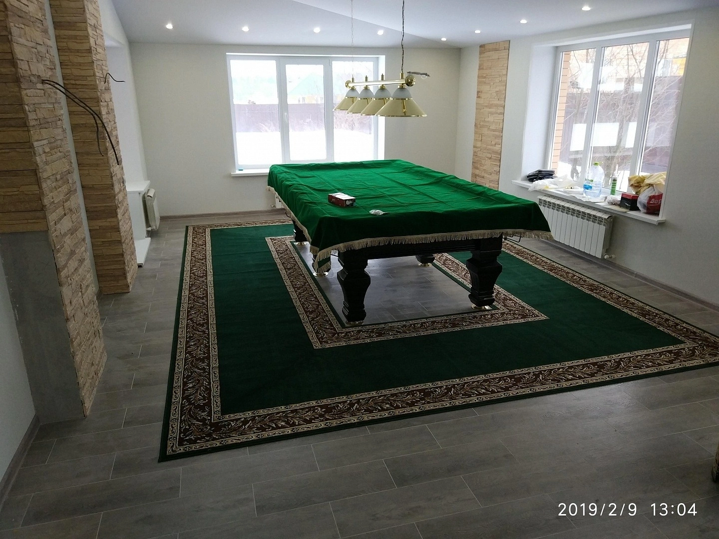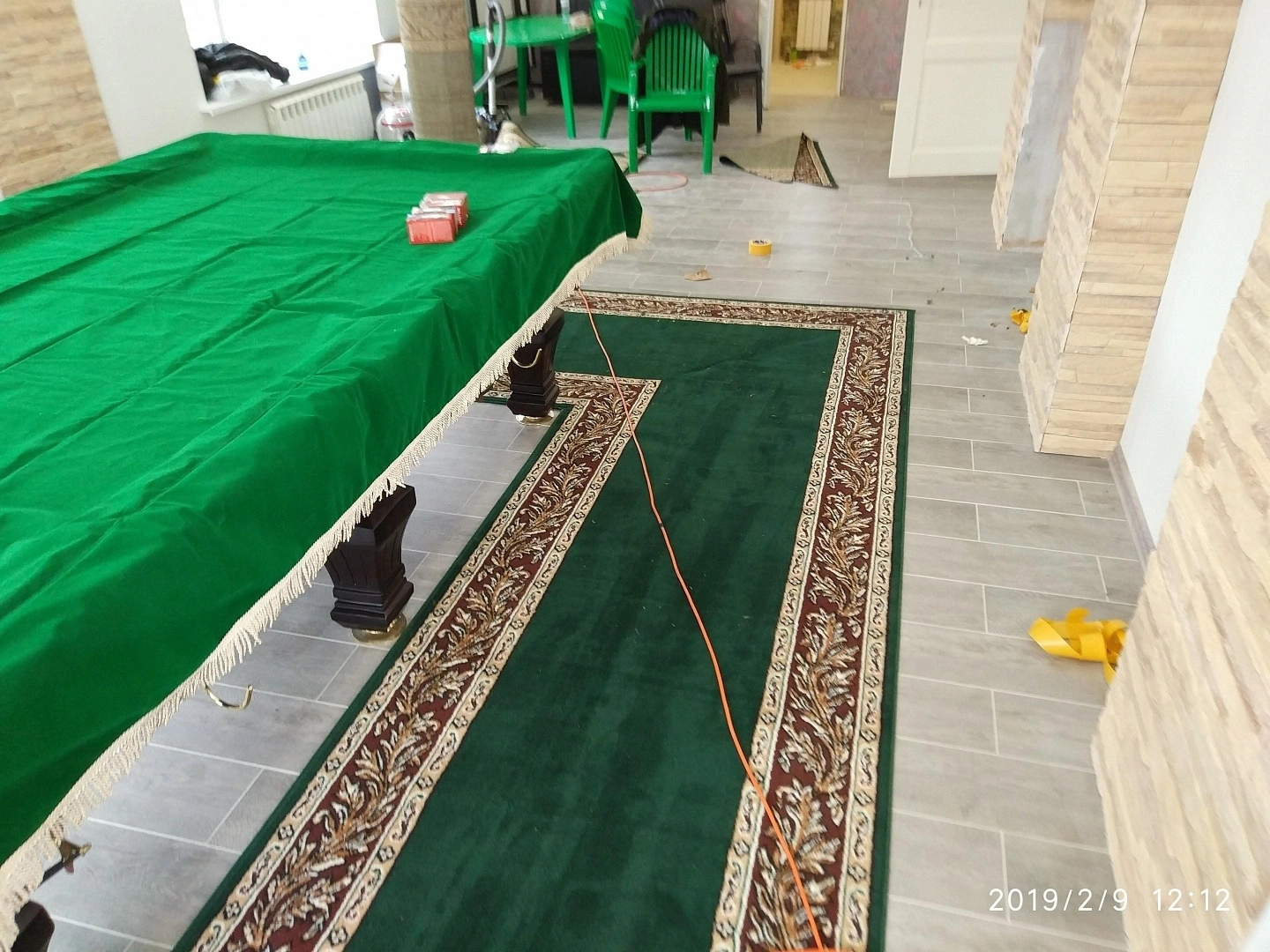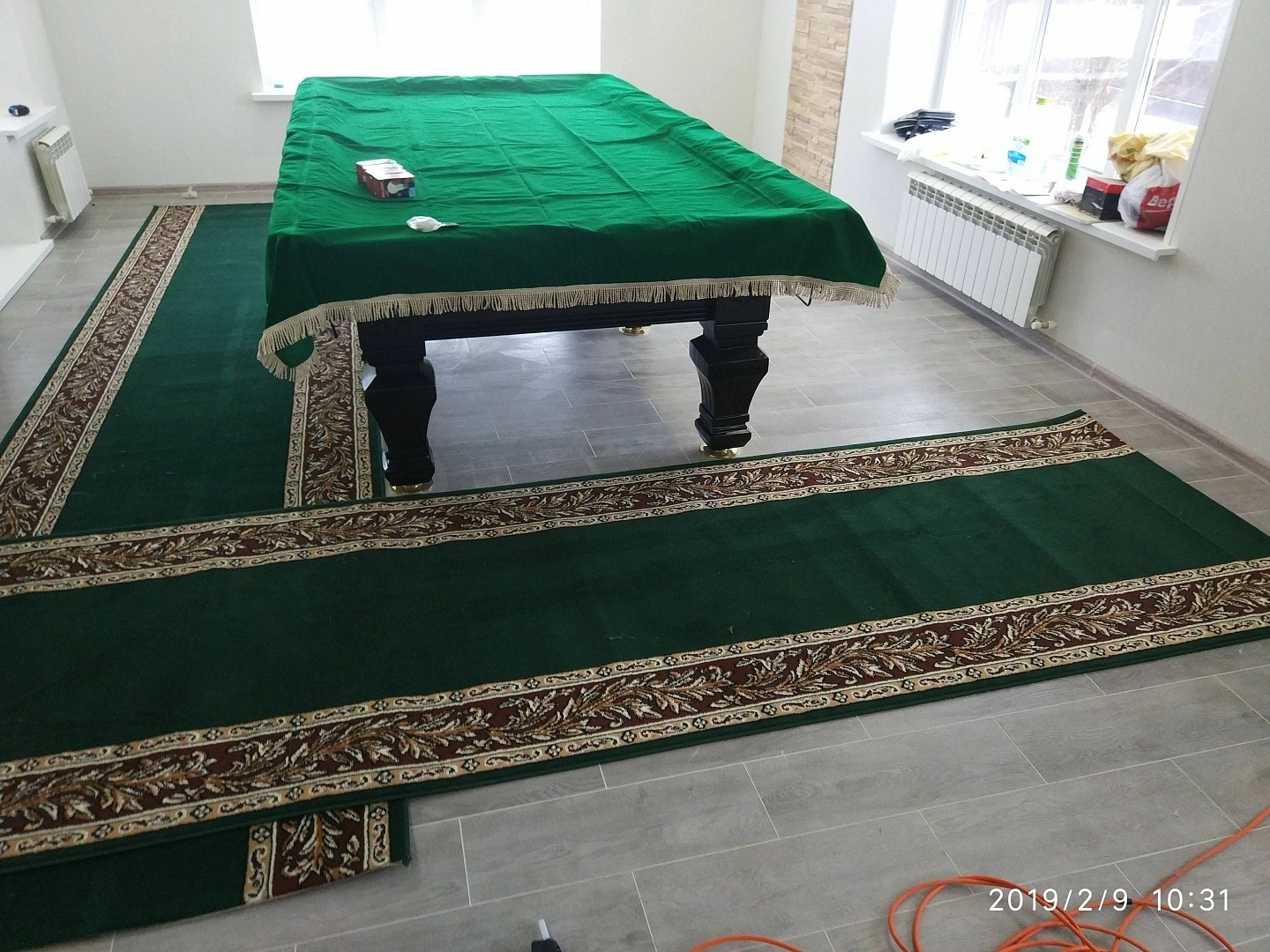 Уложили дорожку вокруг бильярдного стола. Дорожка фиксировалась на термоклей из пистолета, для того ,чтобы не оставлять следов на керамограните.Сделали оверлок.