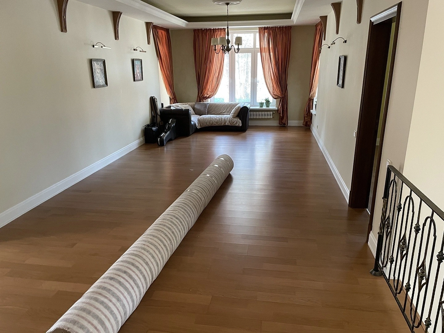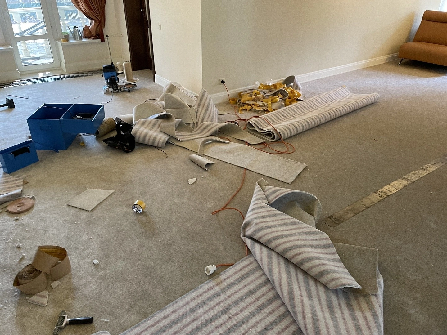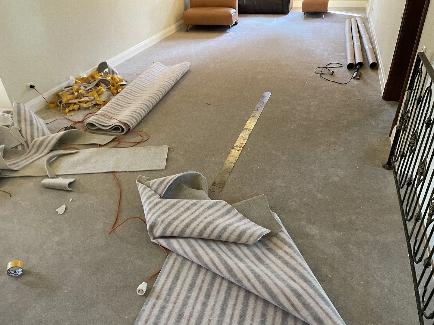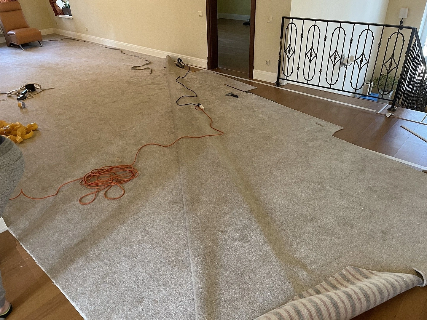 На втором этаже коттеджа уложили ковролин. Сварили швы,сделали оверлок на месте.Укладку делалали на двусторонний скотч.
