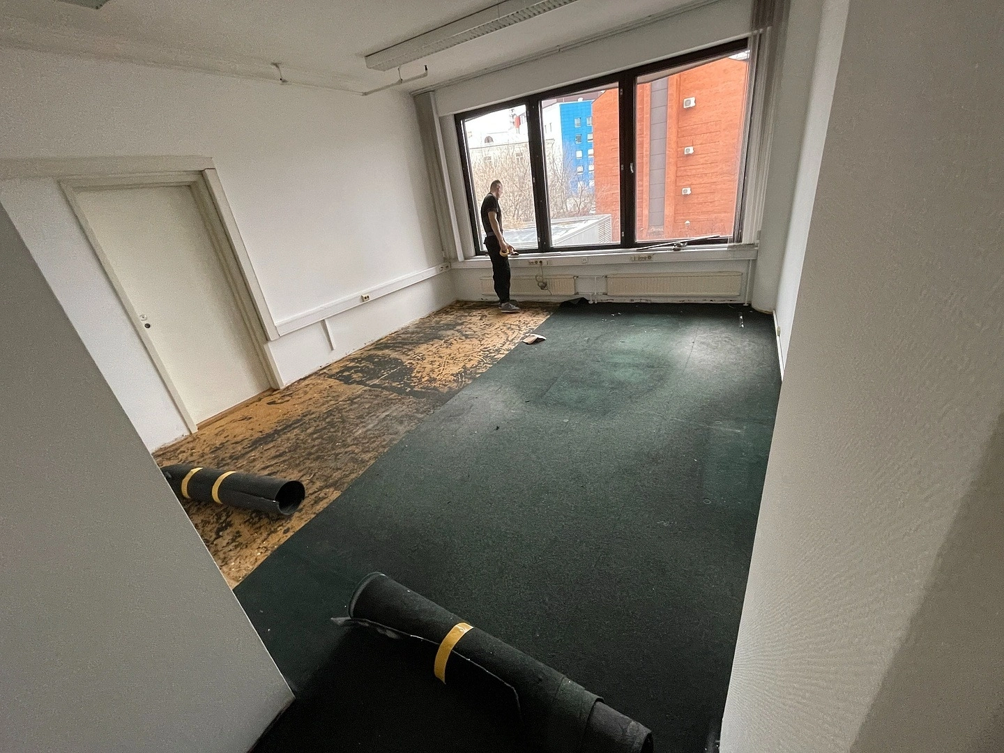 Сделали демонтаж основания , постелили подложку на клей, постелили ковролин на подложку и на клей.