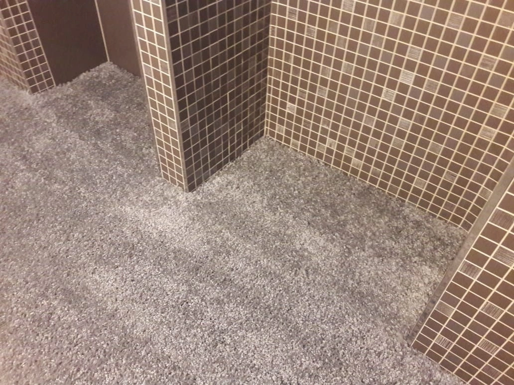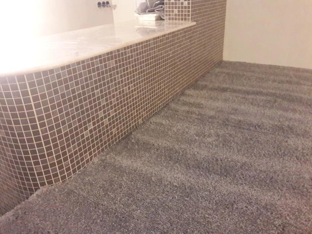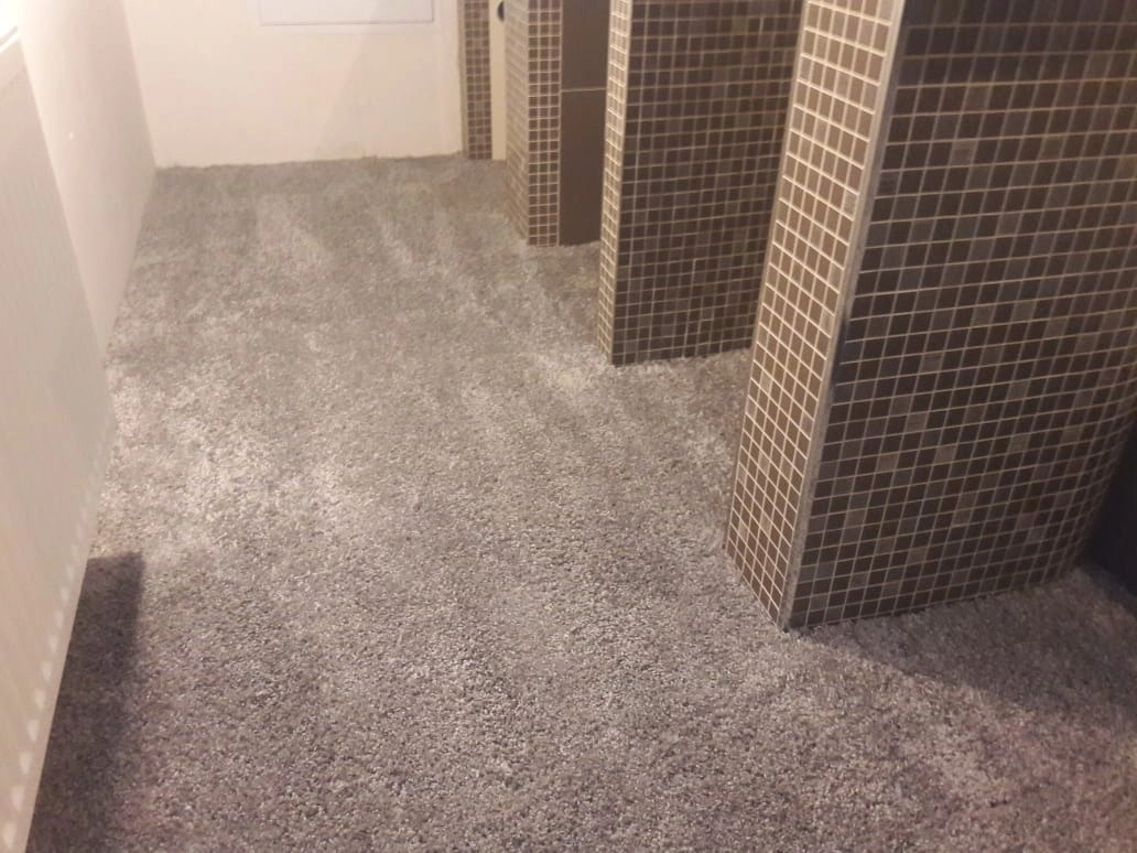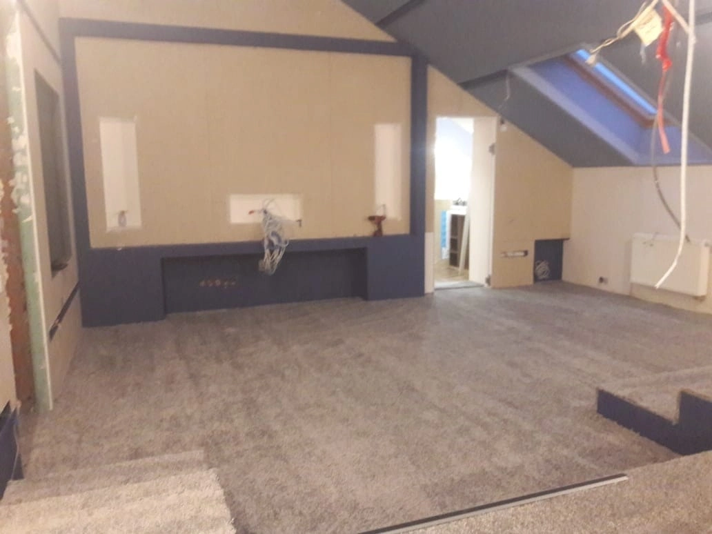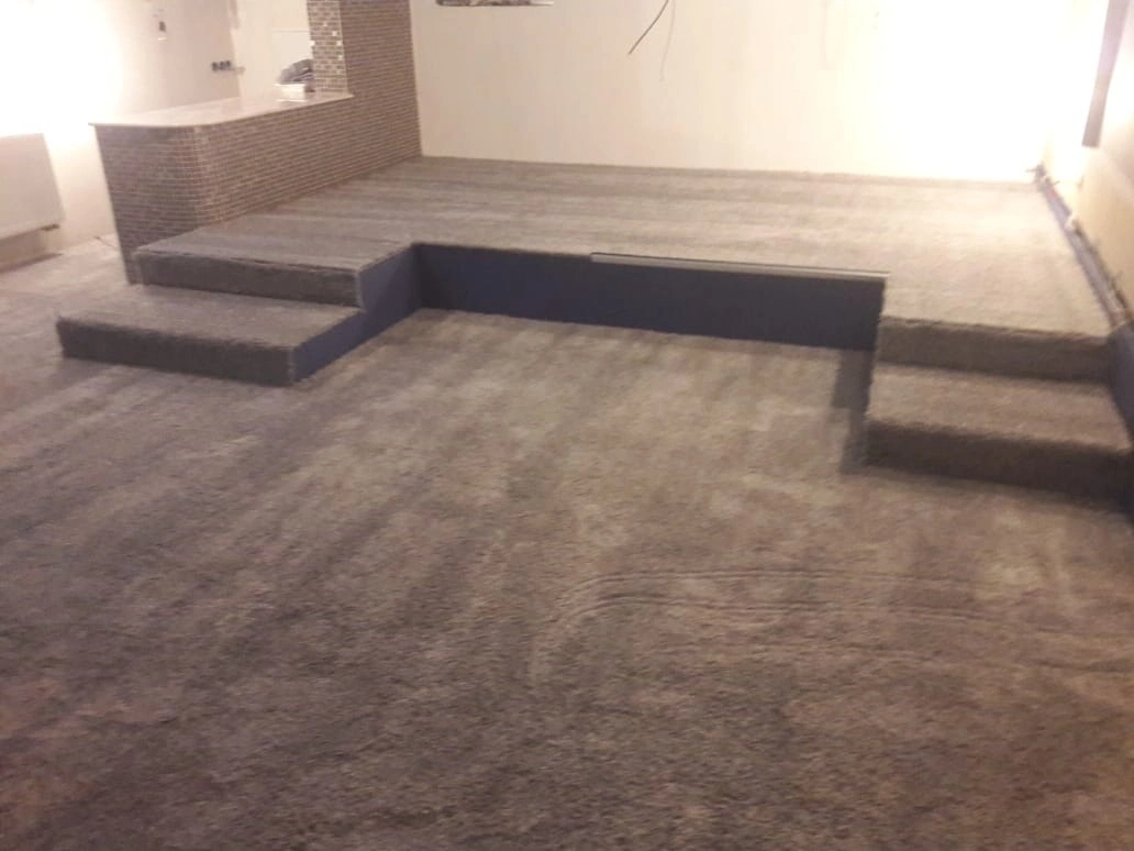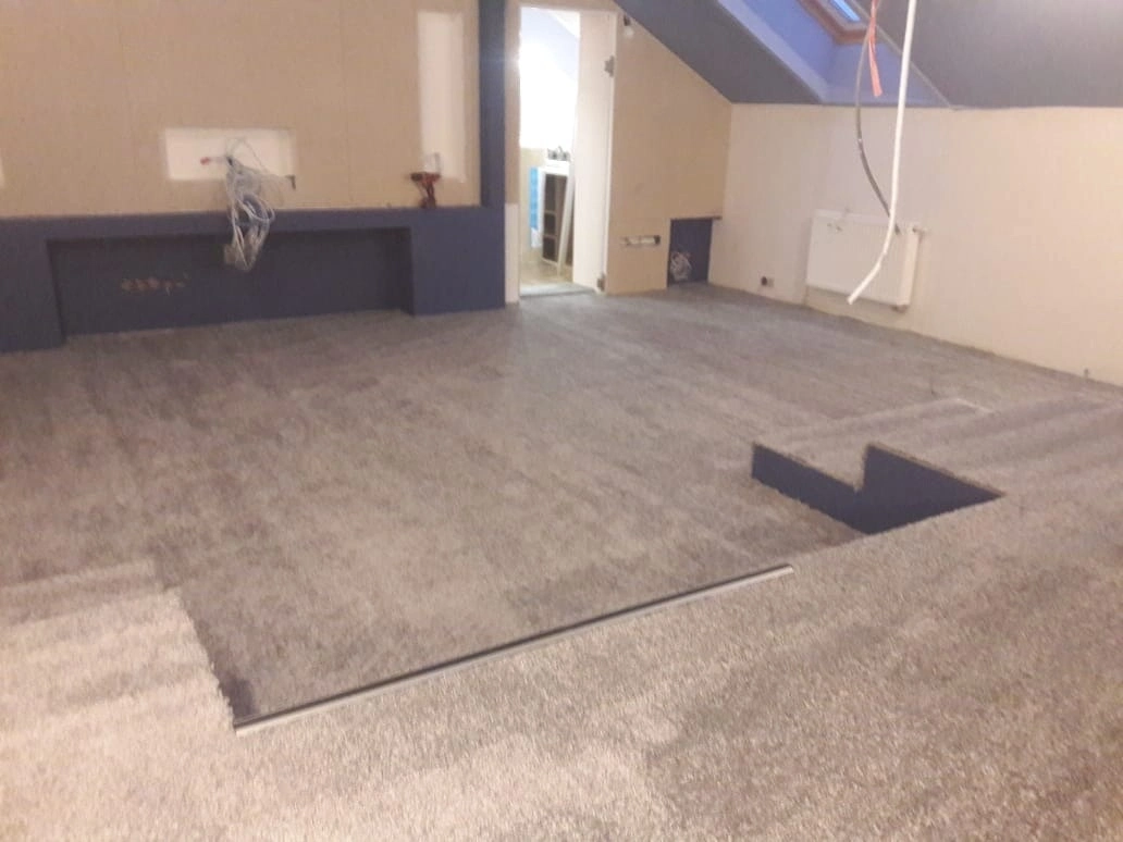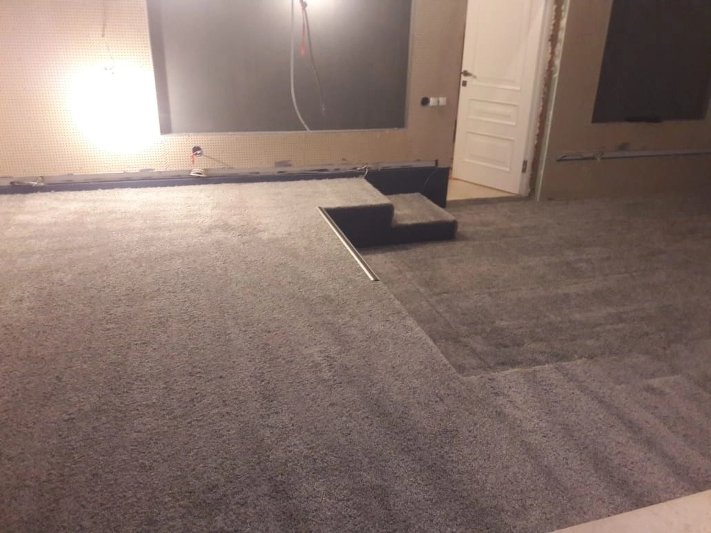 Произвели укладку ковролина в домашнем кинозале. Укладка была сделана на клей.Сделали спайку швов коврового покрытия.