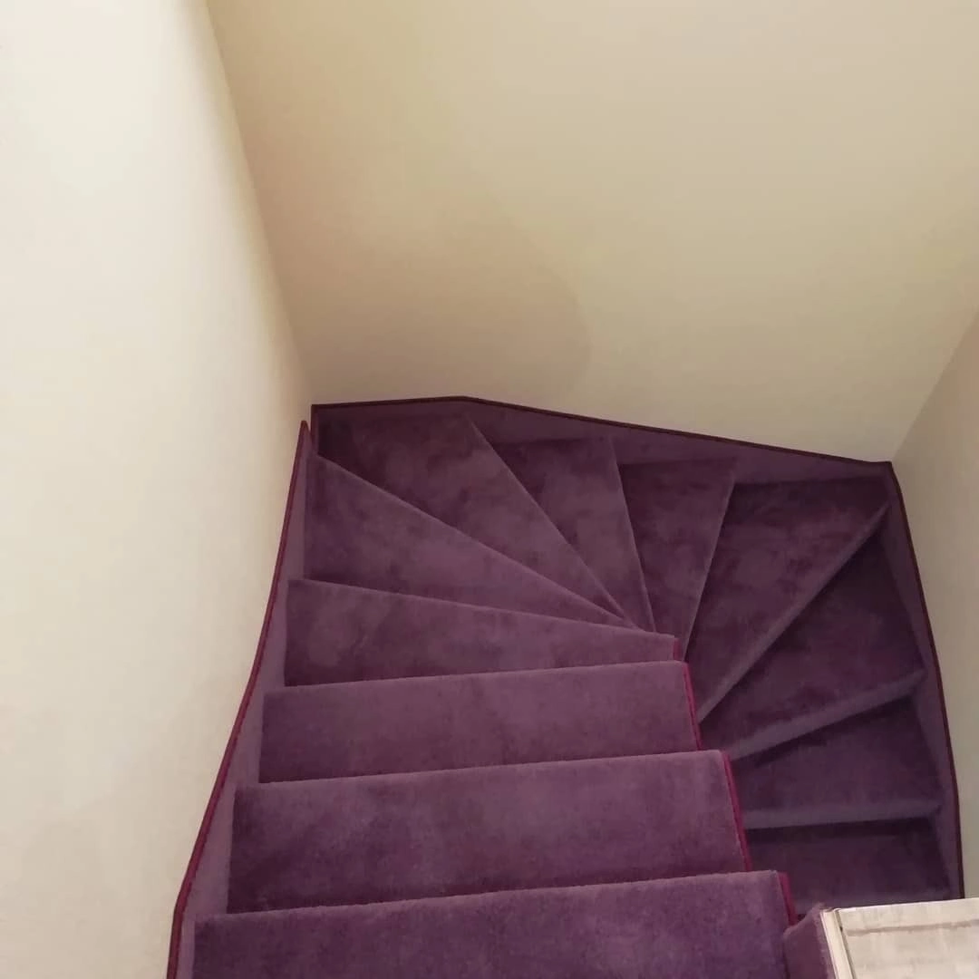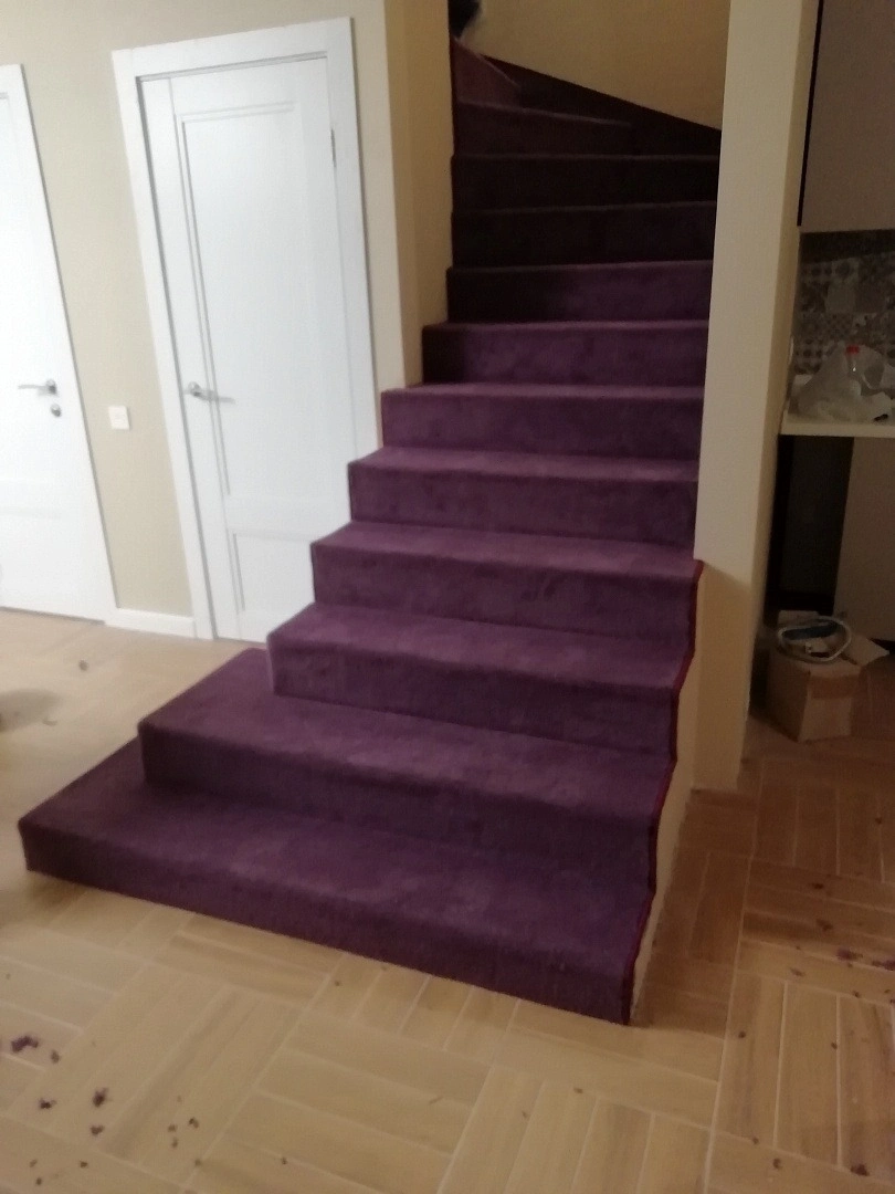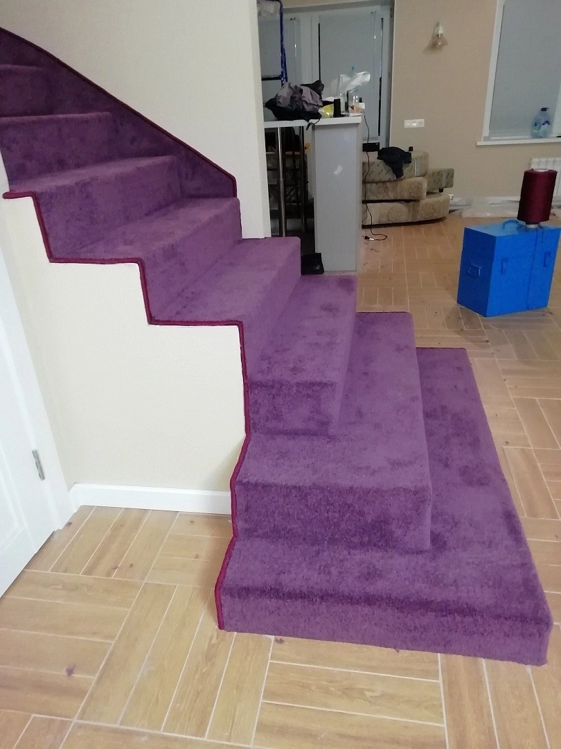 Ремонтной смесью выровняли ступени, сделали монтаж коврового плинтуса с оверлоченным бортиком на лестницу и обрамление каждой ступени. Выполнили укладку ковролина ,предварительно сделав раскрой и оверлок отдельных частей.