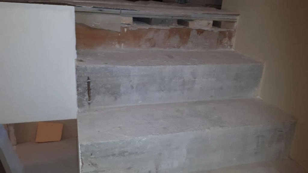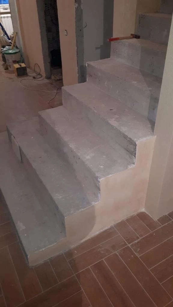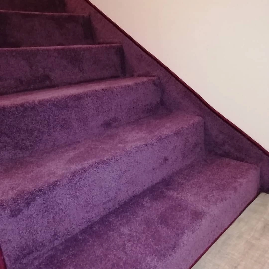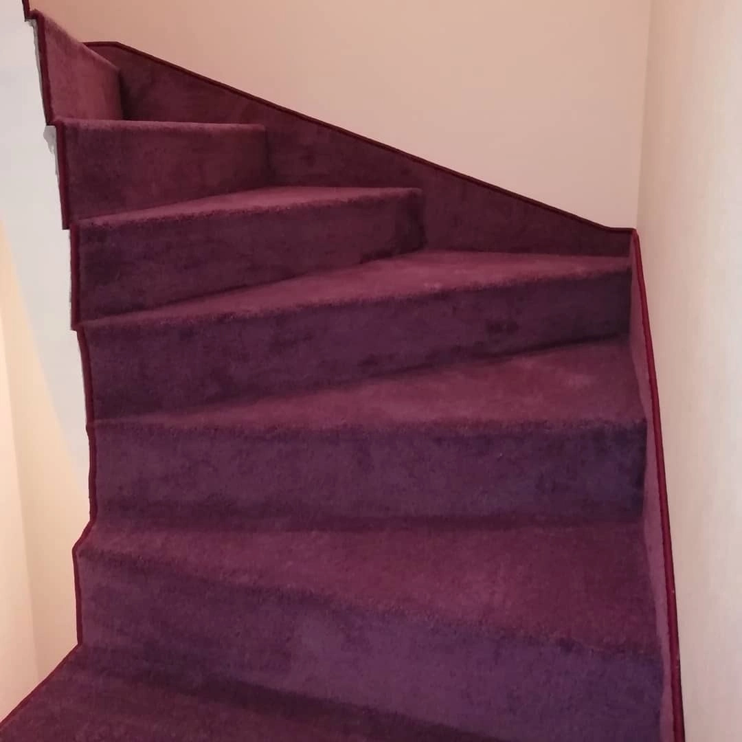 Ремонтной смесью выровняли ступени, сделали монтаж коврового плинтуса с оверлоченным бортиком на лестницу и обрамление каждой ступени. Выполнили укладку ковролина ,предварительно сделав раскрой и оверлок отдельных частей.