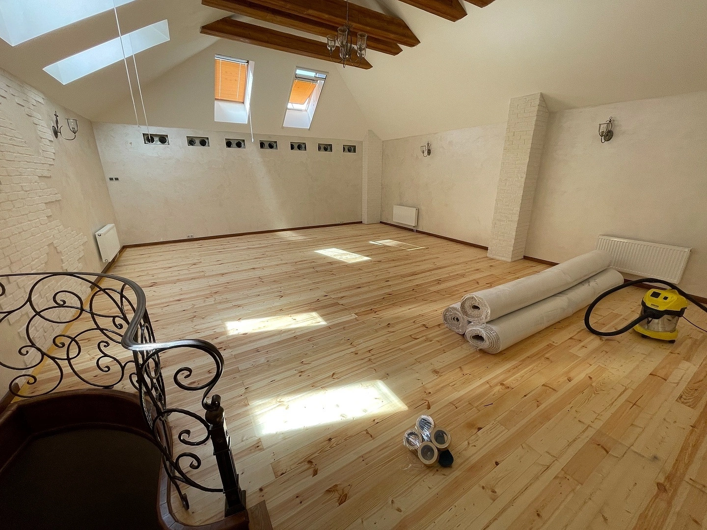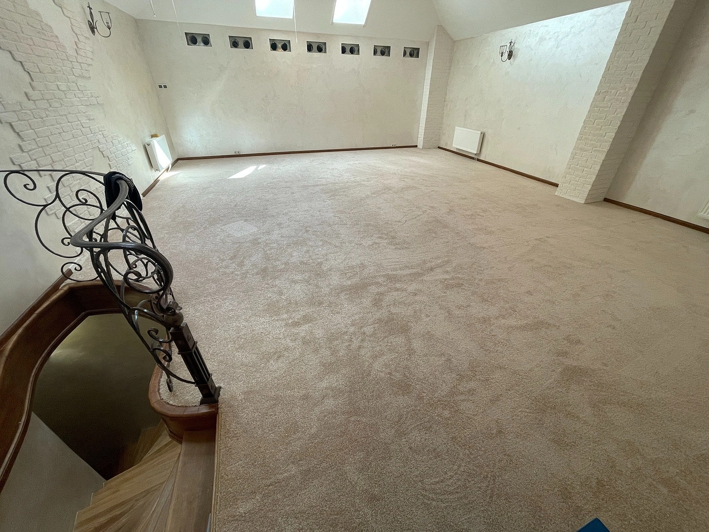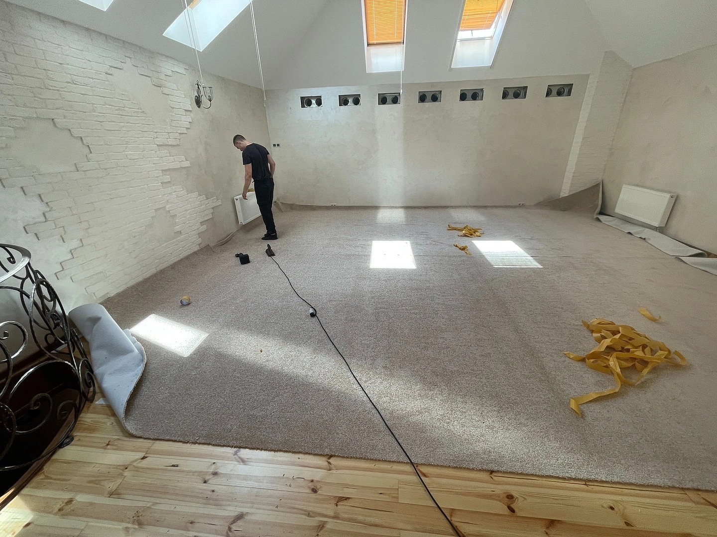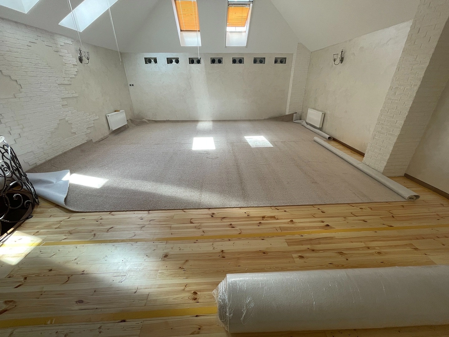 Уложили Ковролин в игровой комнате для детей.Укладку сделали на двусторонний скотч . Спаяли между собой два куска, сделали оверлок