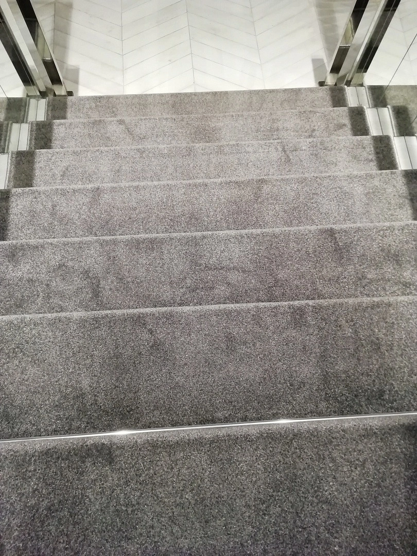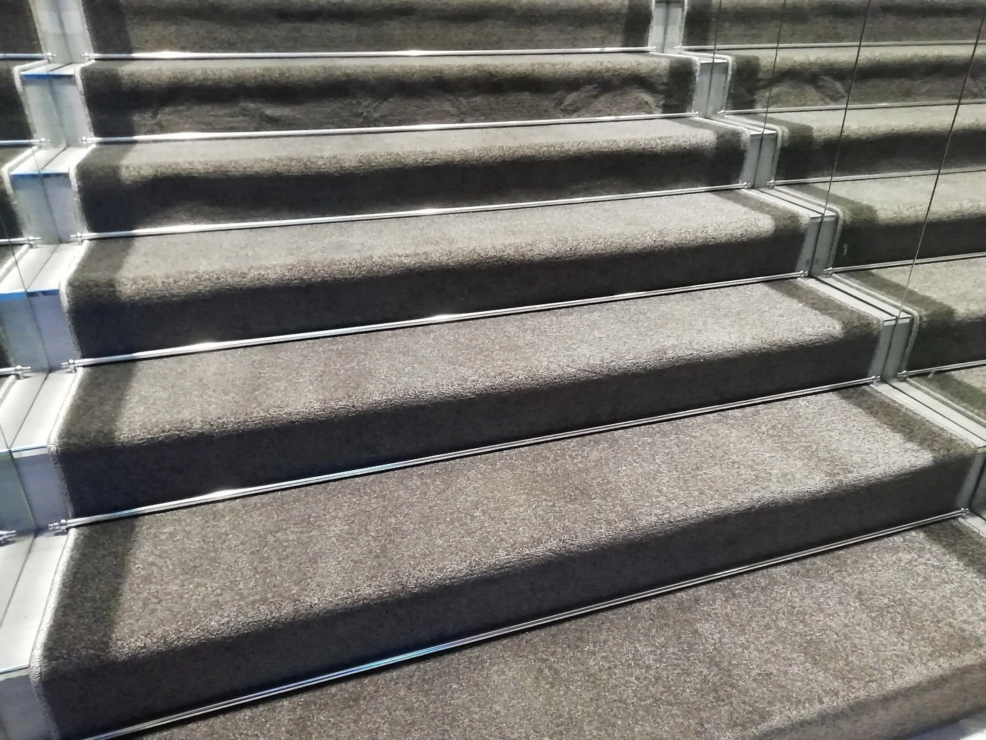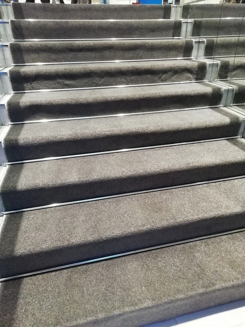 Установили ковродержатели на керамогранитные ступени. Сделали укладку ковролина на двусторонний скотч. Оверлок на месте.