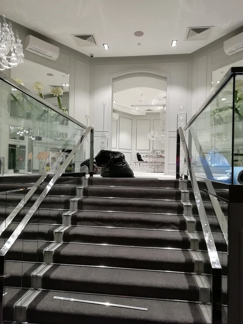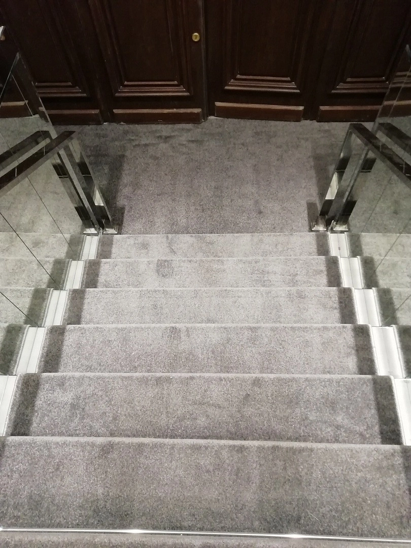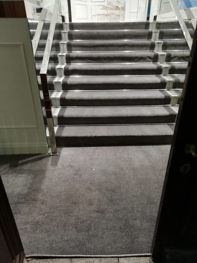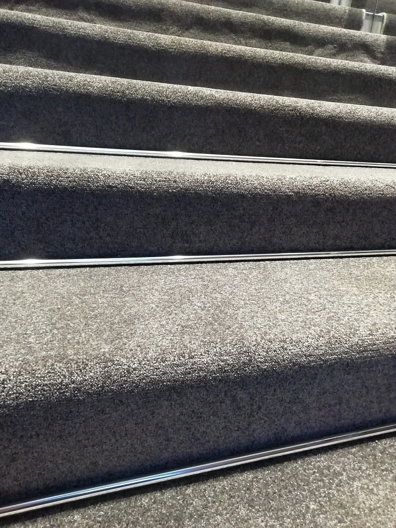 Установили ковродержатели на керамогранитные ступени. Сделали укладку ковролина на двусторонний скотч. Оверлок на месте.