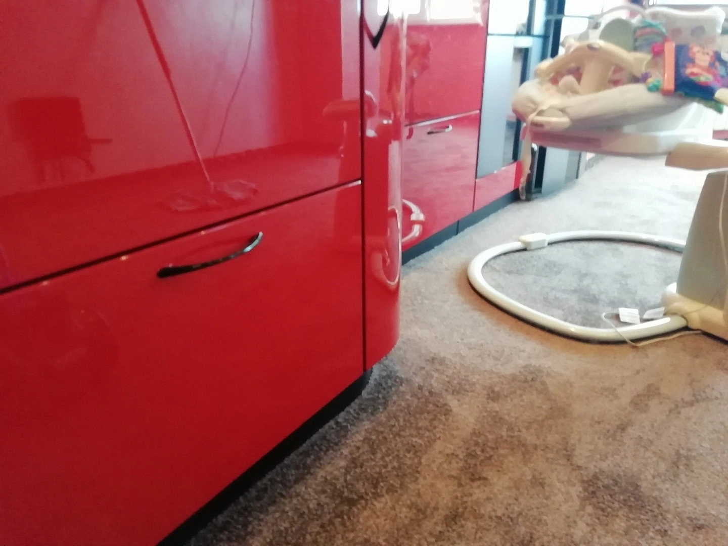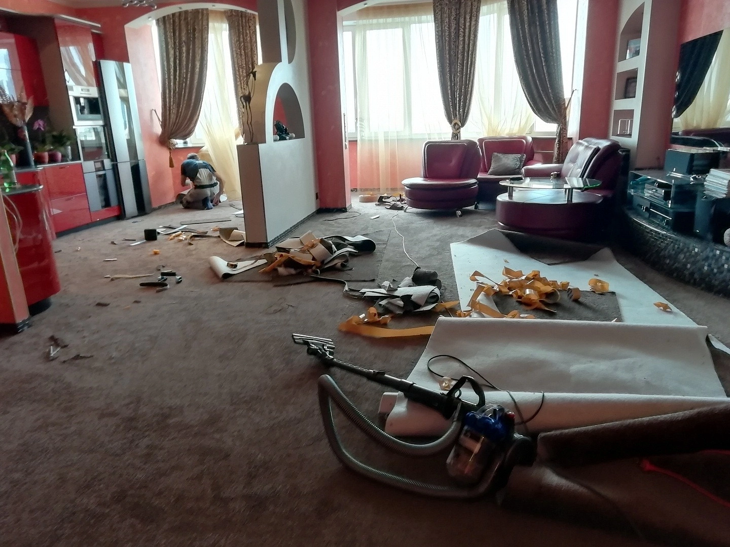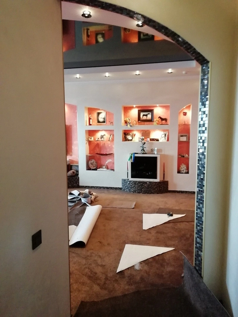 Уложили ковролин в кухне-гостиной. Сделали спайку швов и оверлок на месте