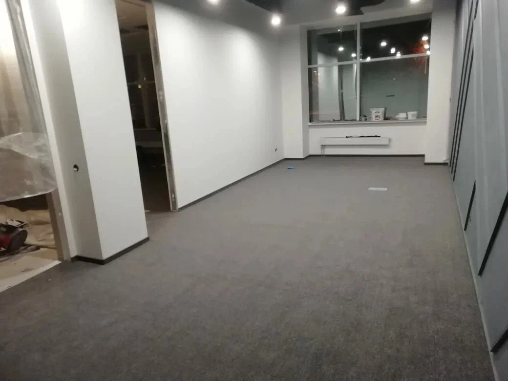 На клей произвели укладку ковролина в офисе. Вырезали по размерам и сделали оверлок края.
