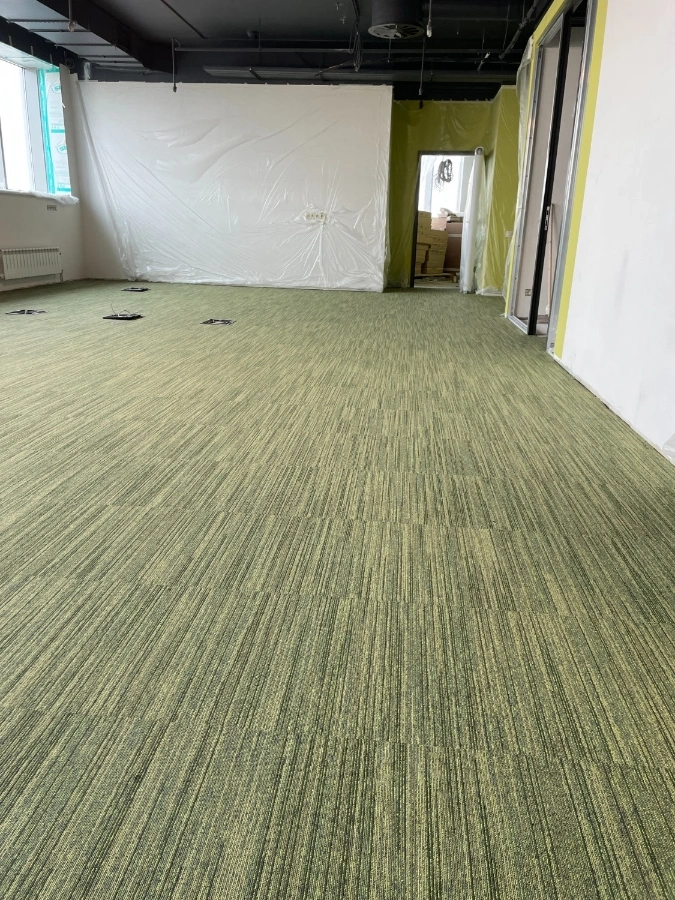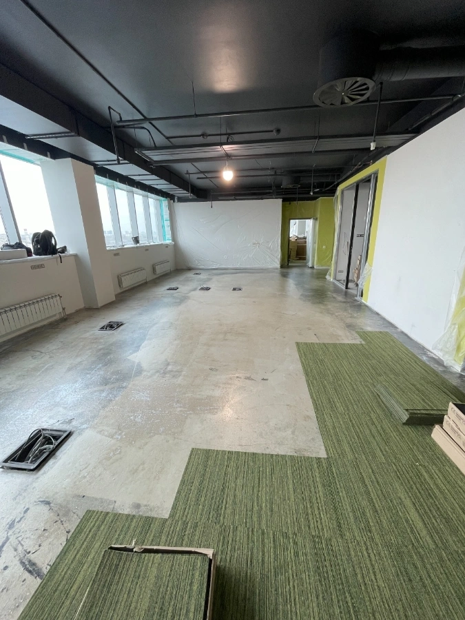 Укладка ковровой плитки в офисе мастерской "КОРОБКА МЕЛА"