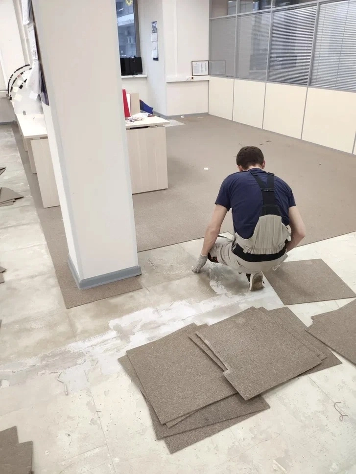 Укладка ковровой плитки в офисе мастерской "КОРОБКА МЕЛА"