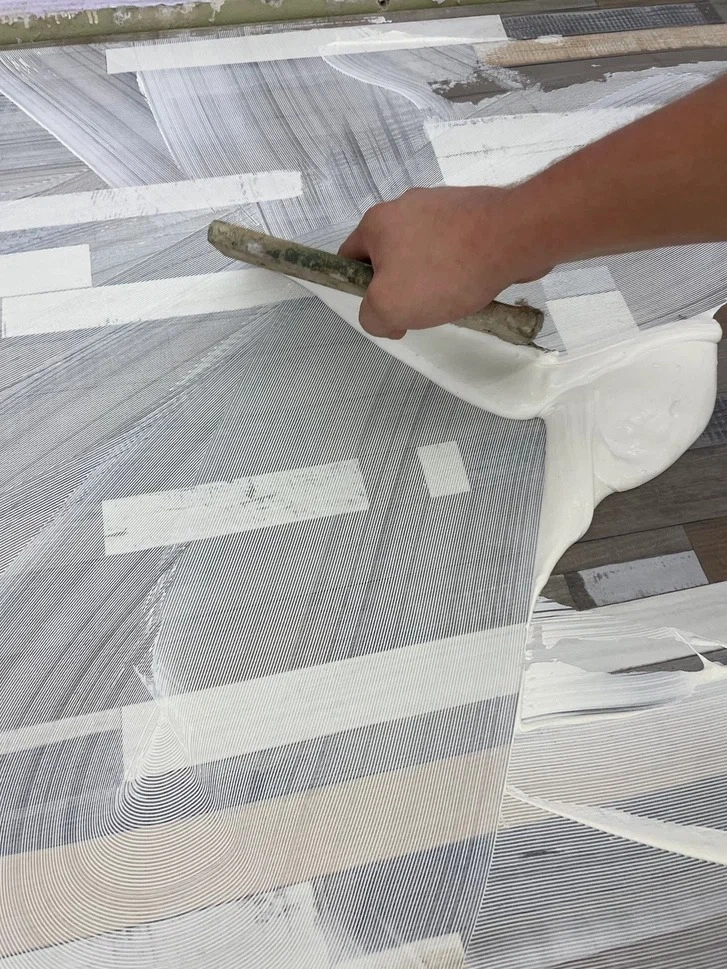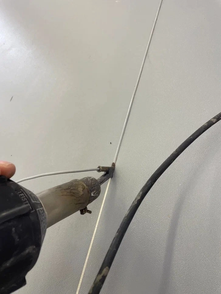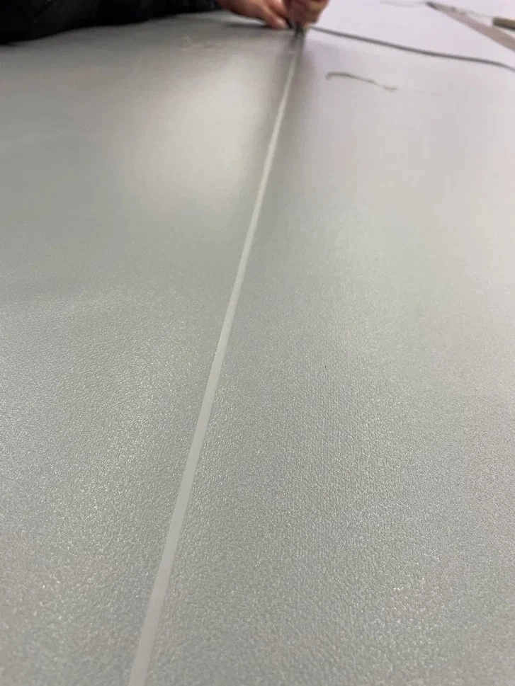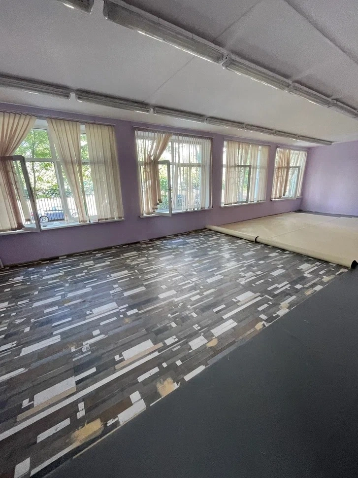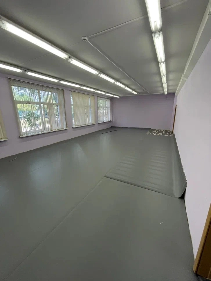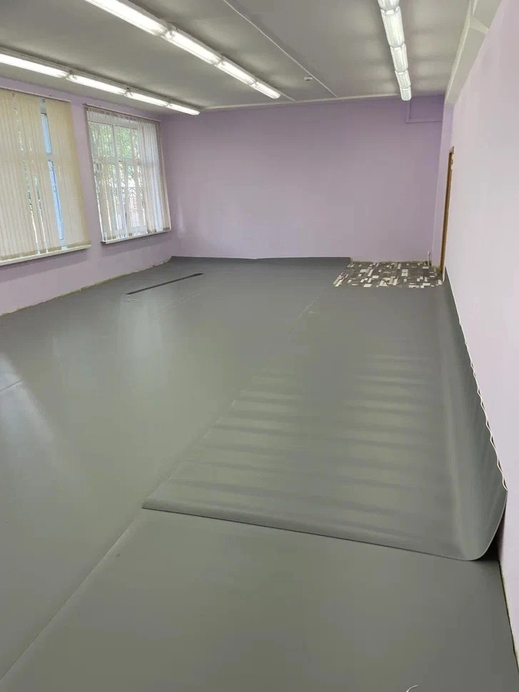 В спортзале школы уложили линолеум .Сделали сварку швов.