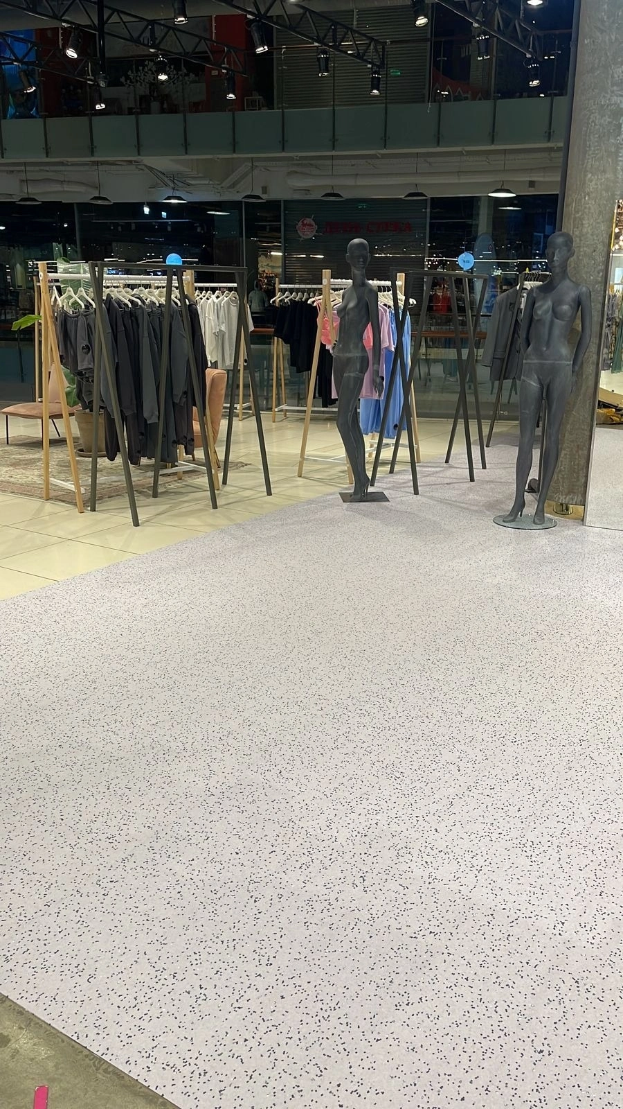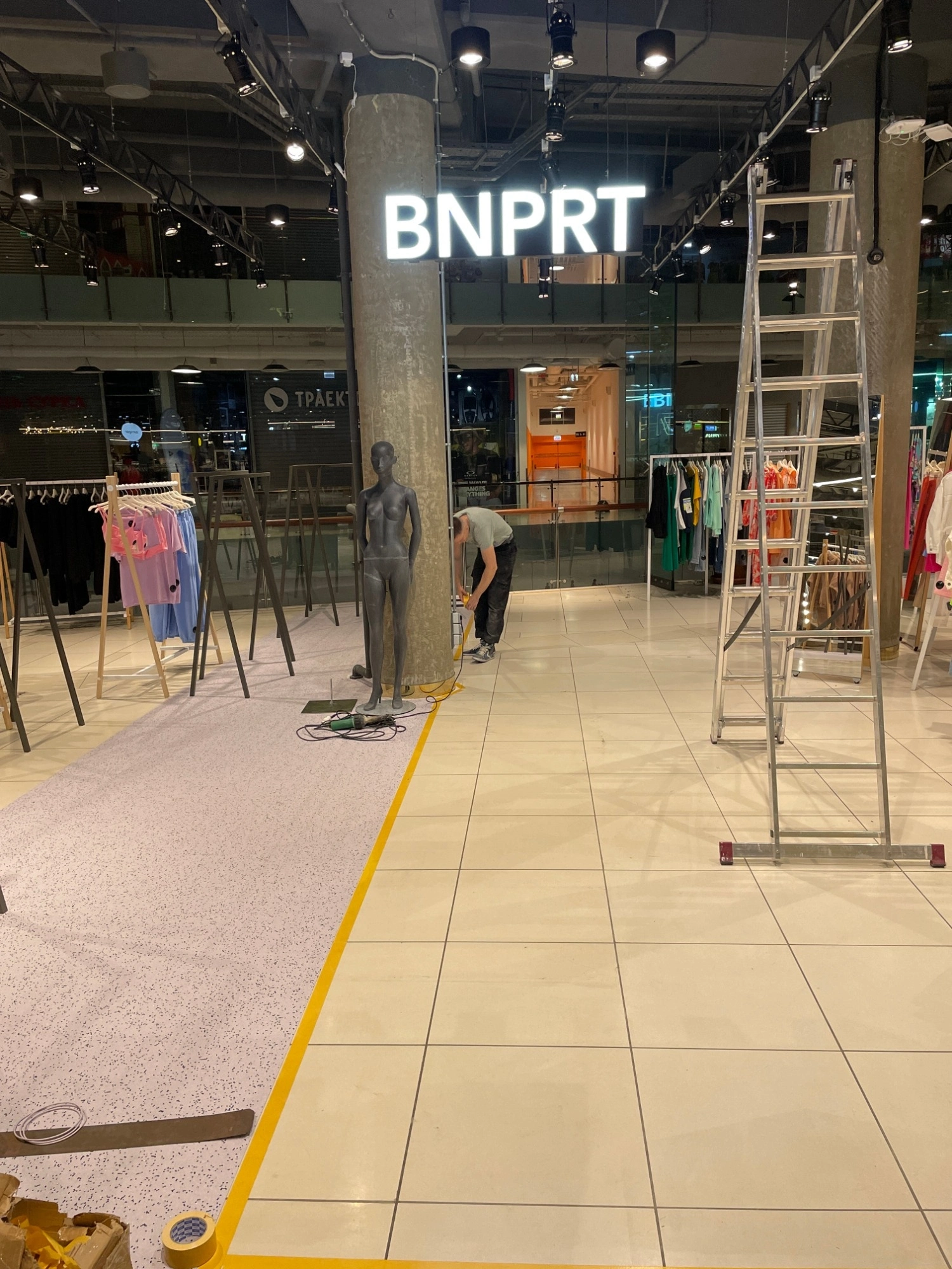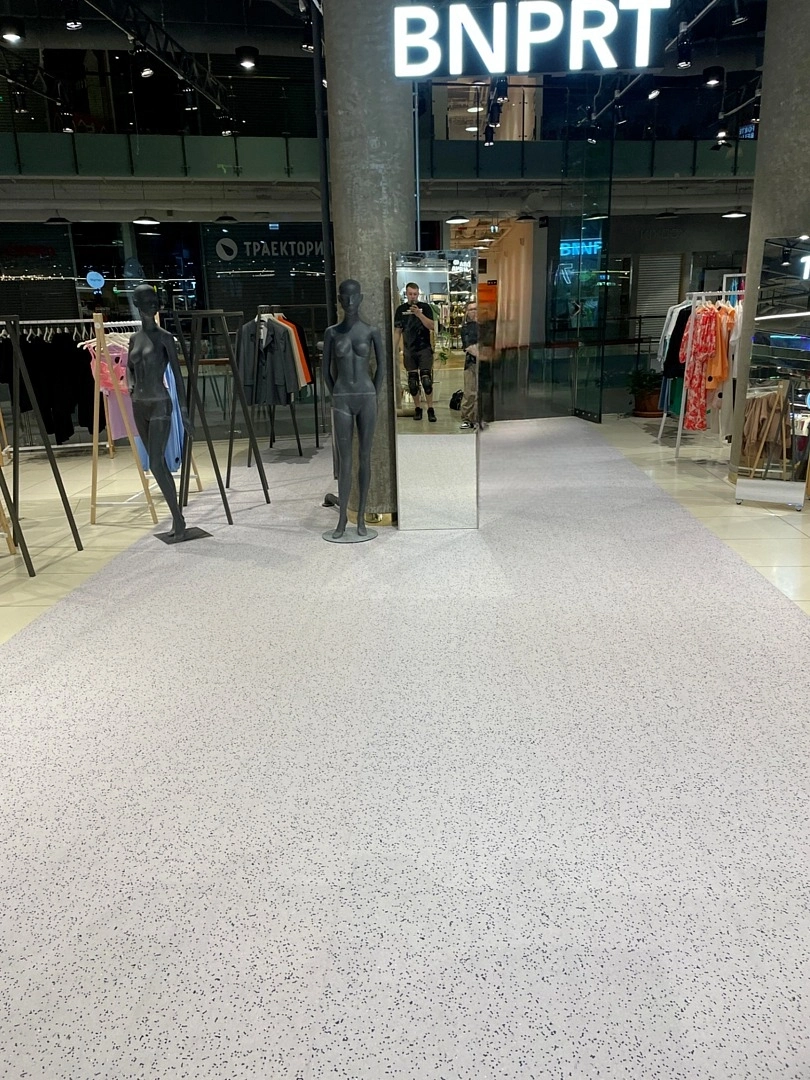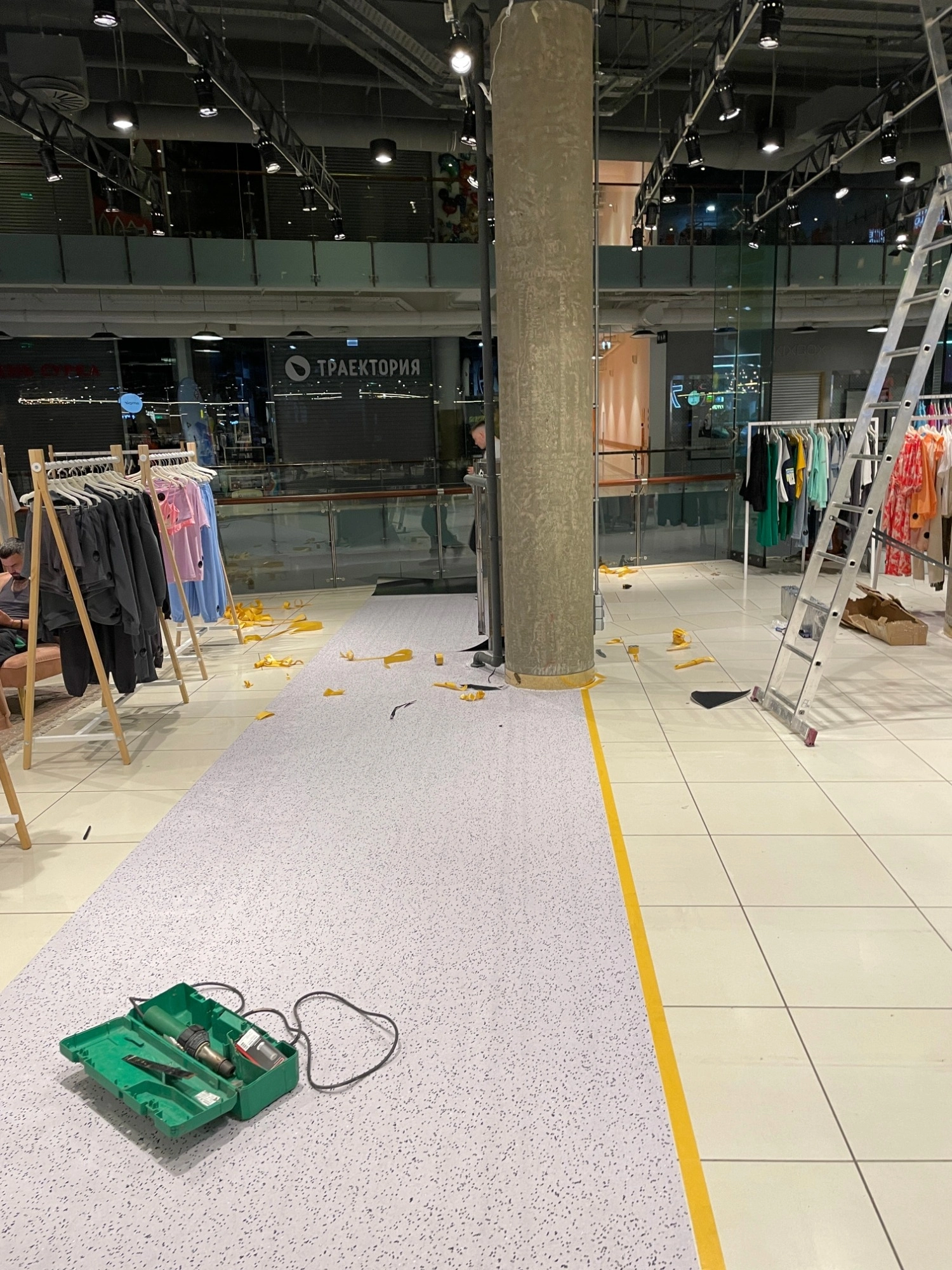 В зоне бутика BNPRT уложили линолеум на скотч.Сварили швы.