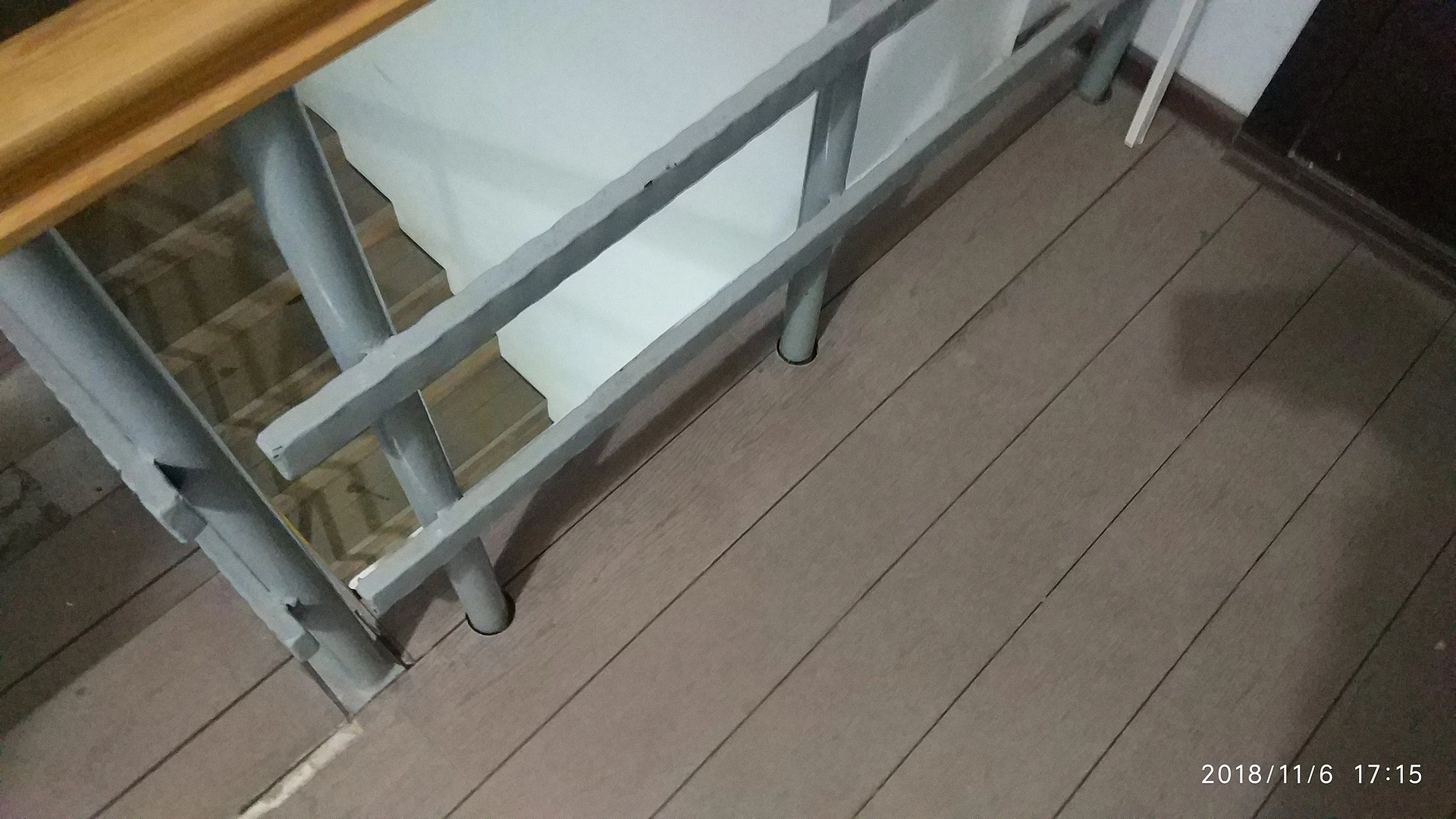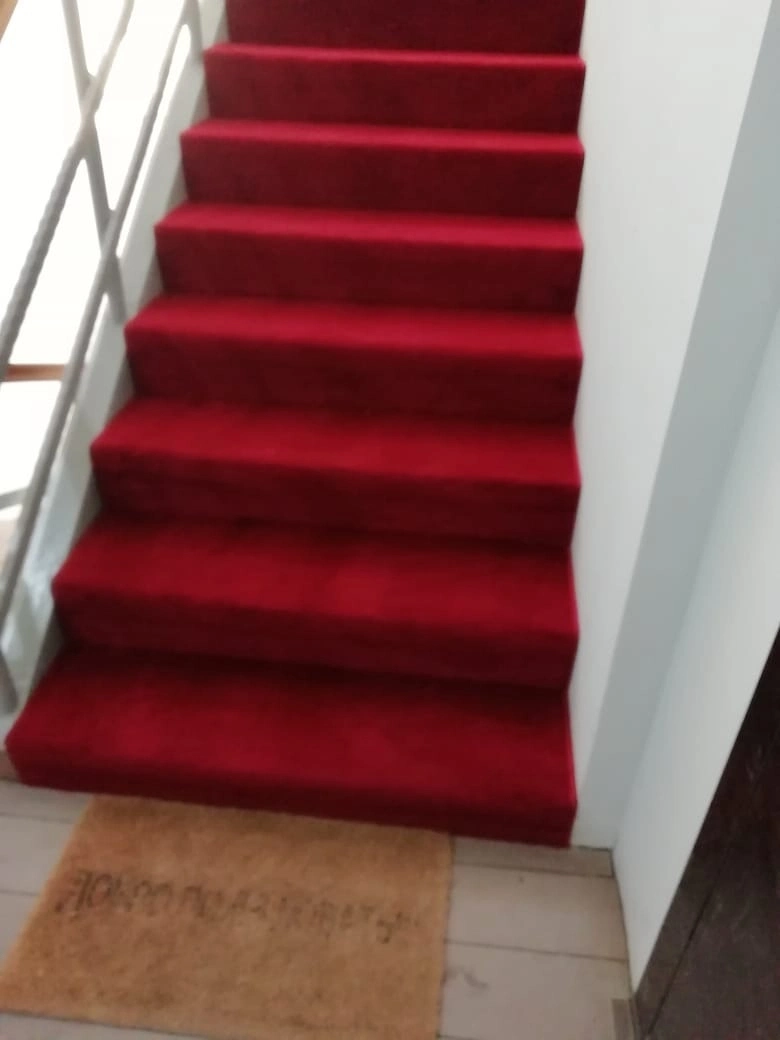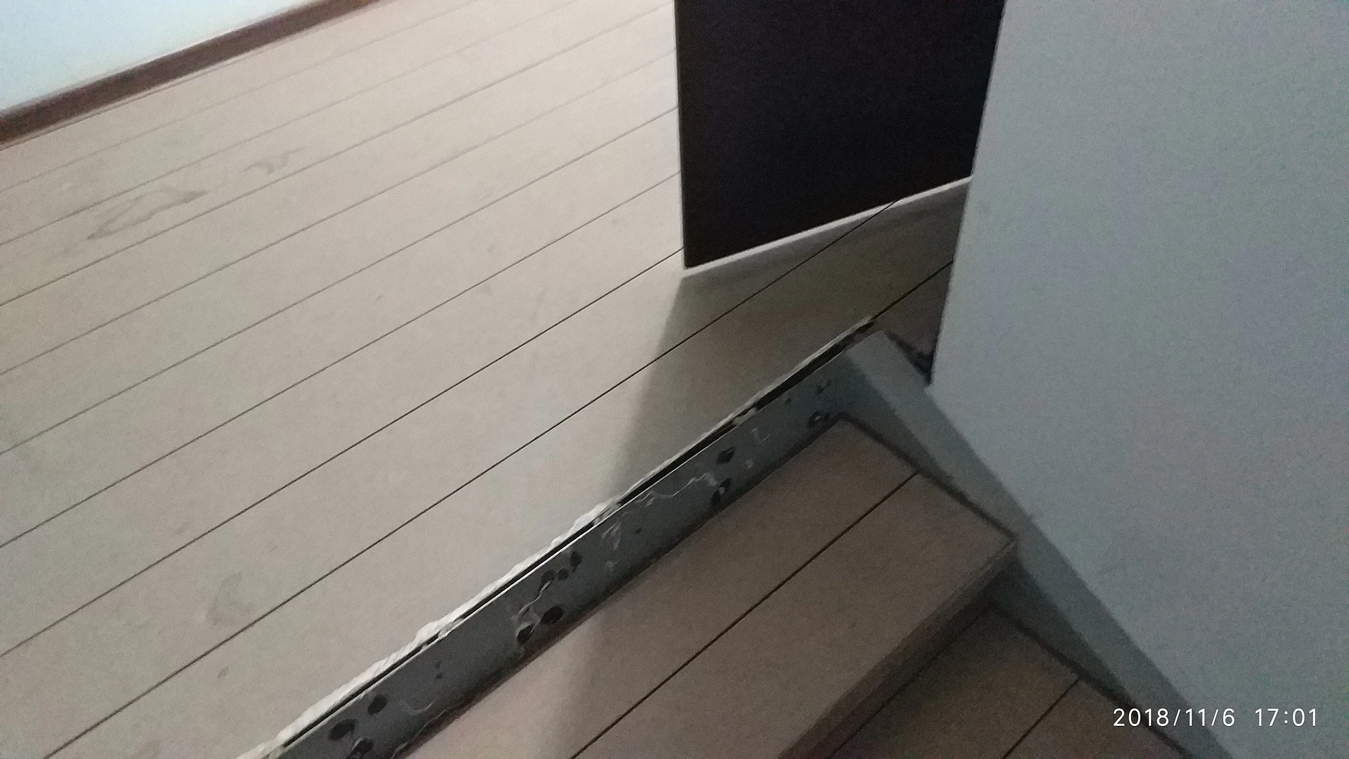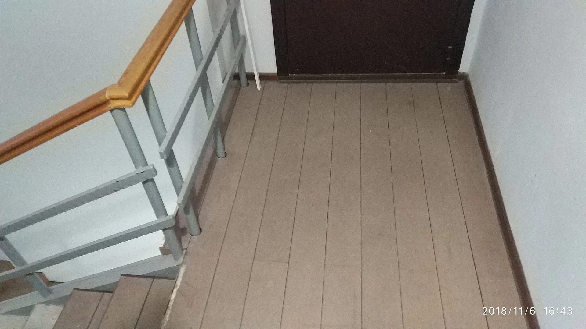 Укладка сделана на скотч, для большего эффекта покрыли ступени и площадки полностью под плинтус. Ступени отремонтировали с помощью жидких гвоздей.