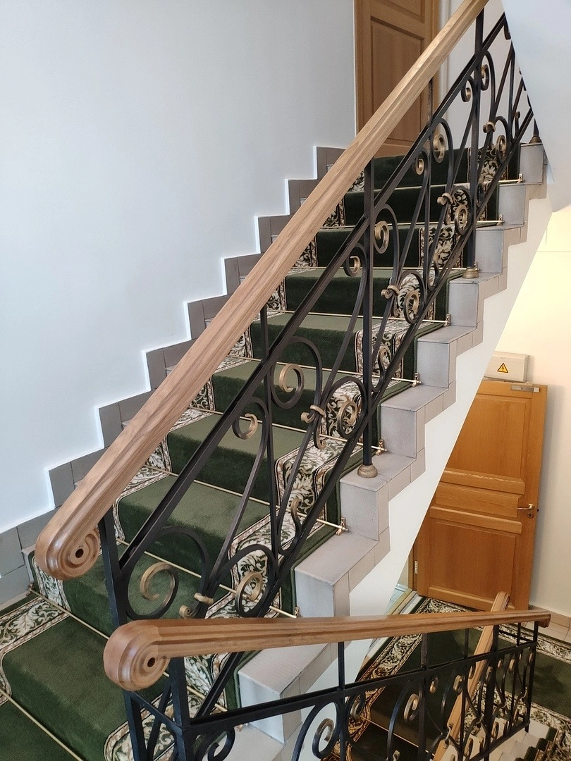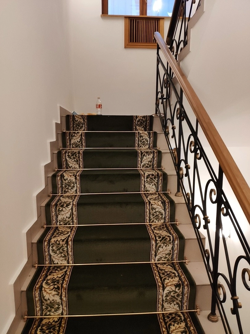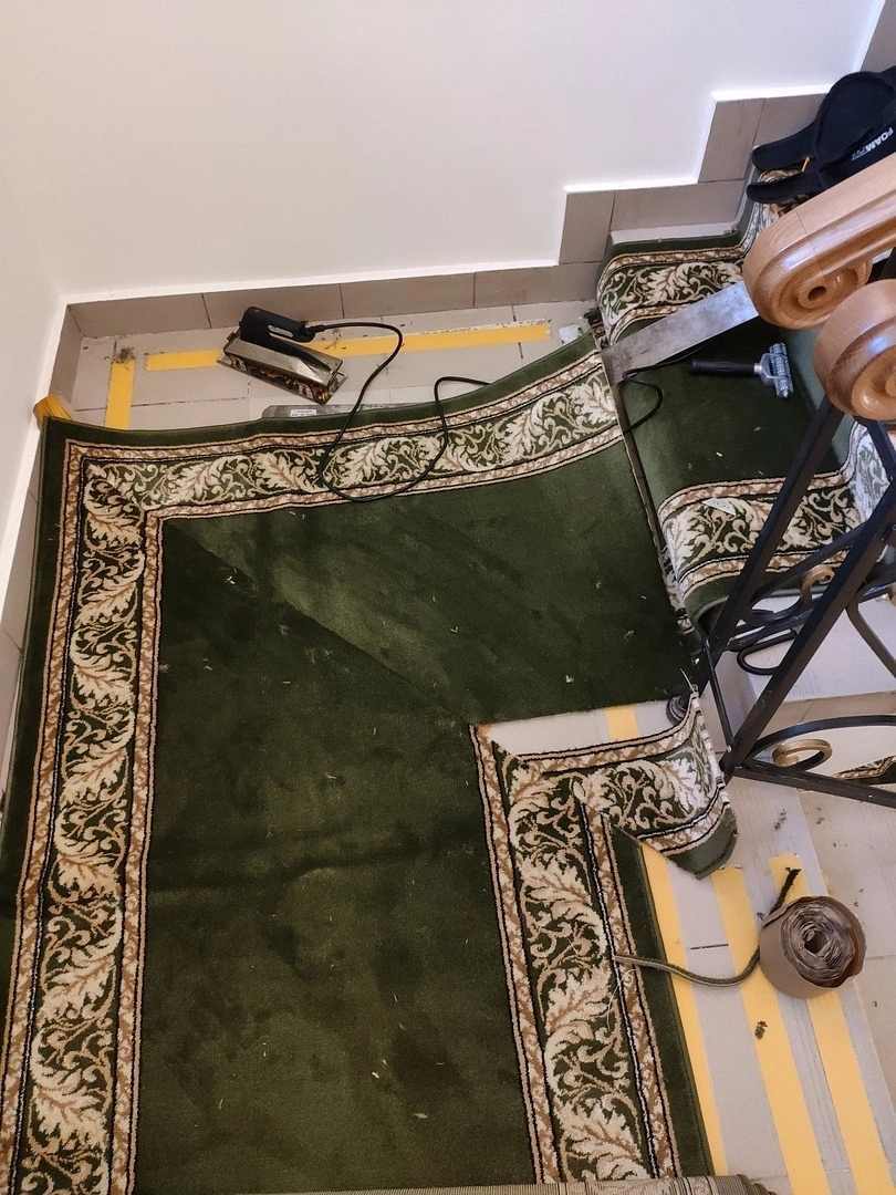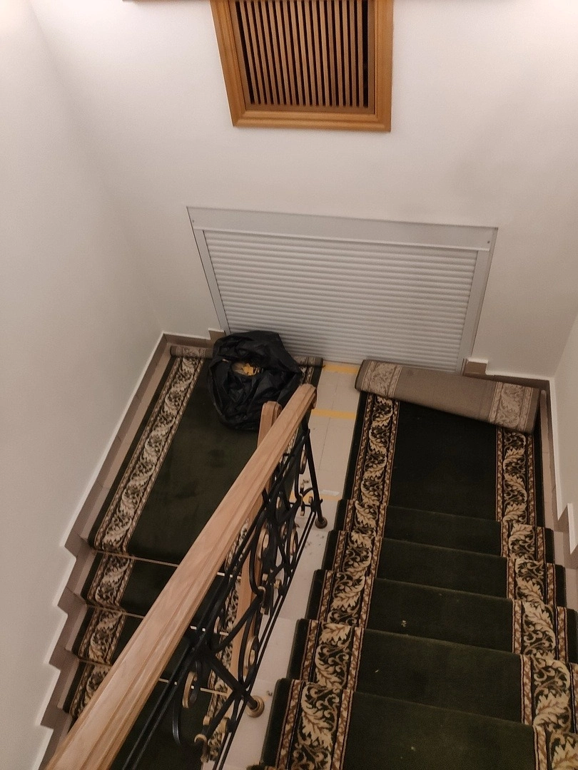 Сделали демонтаж ковродержателей и старой дорожки , Сделали укладку дорожки на ступени с площадками, местами с заужениями.Сварили швы, установили новые ковродержатели