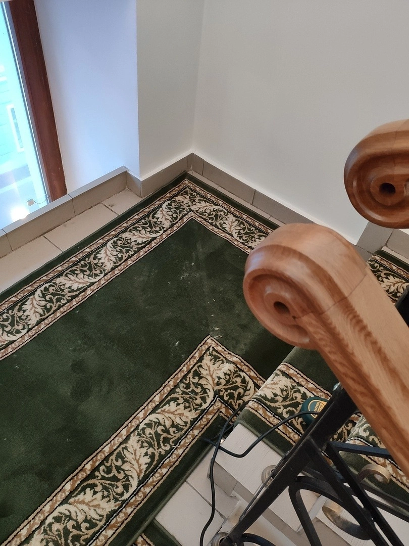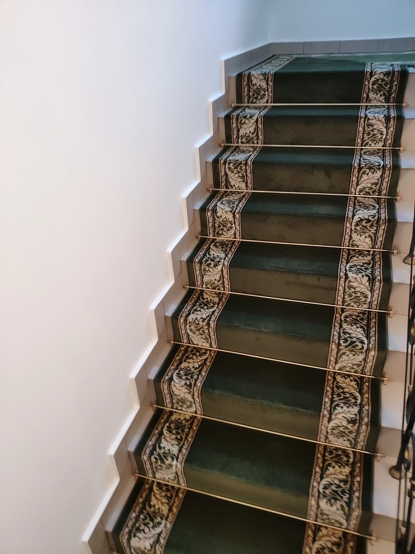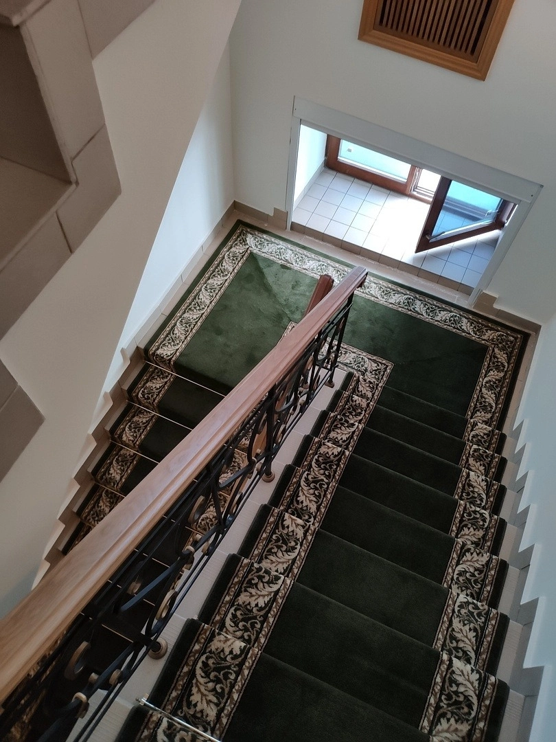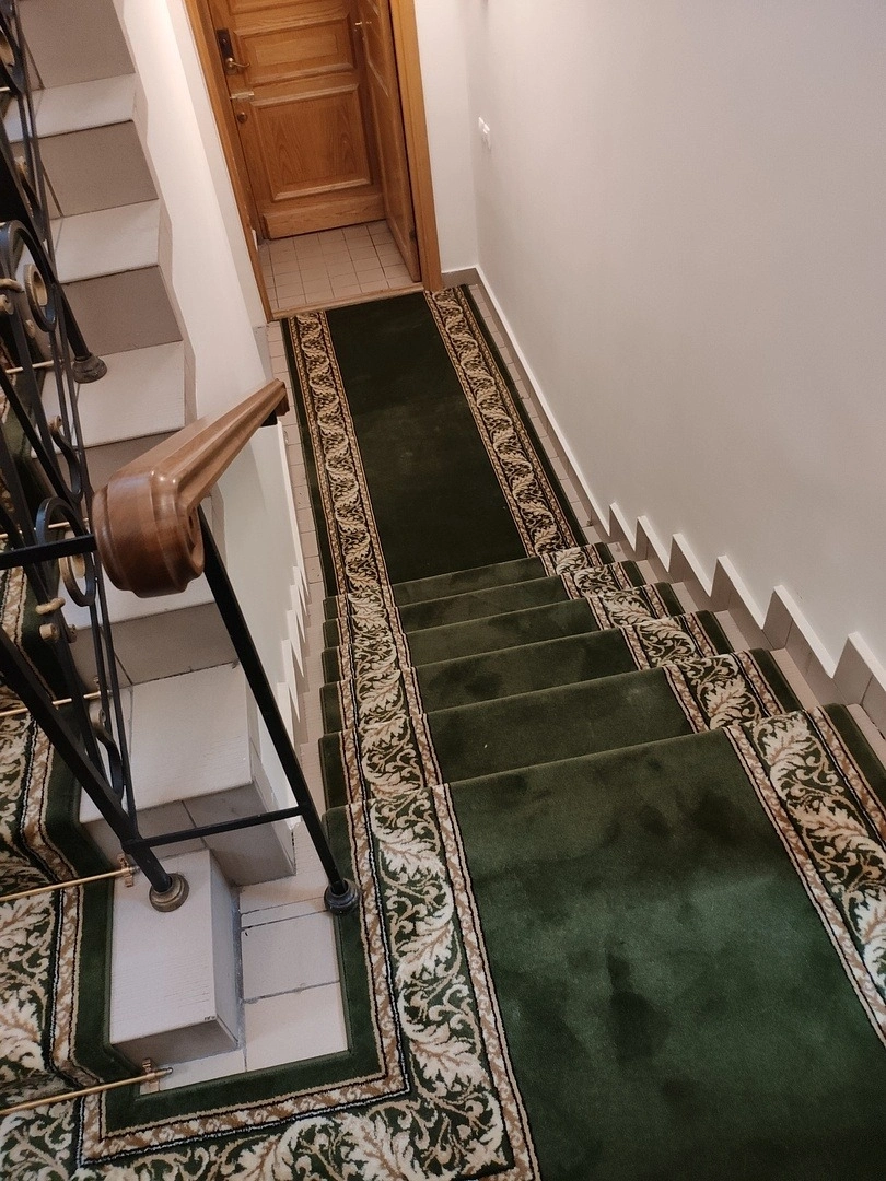 Сделали демонтаж ковродержателей и старой дорожки , Сделали укладку дорожки на ступени с площадками, местами с заужениями.Сварили швы, установили новые ковродержатели