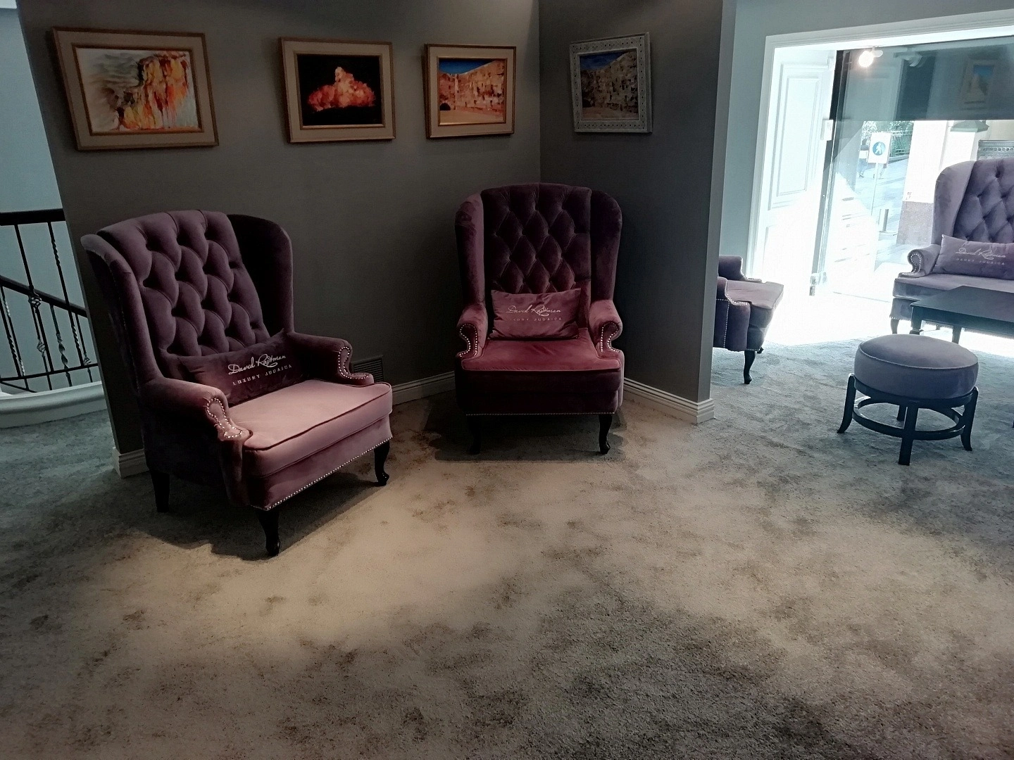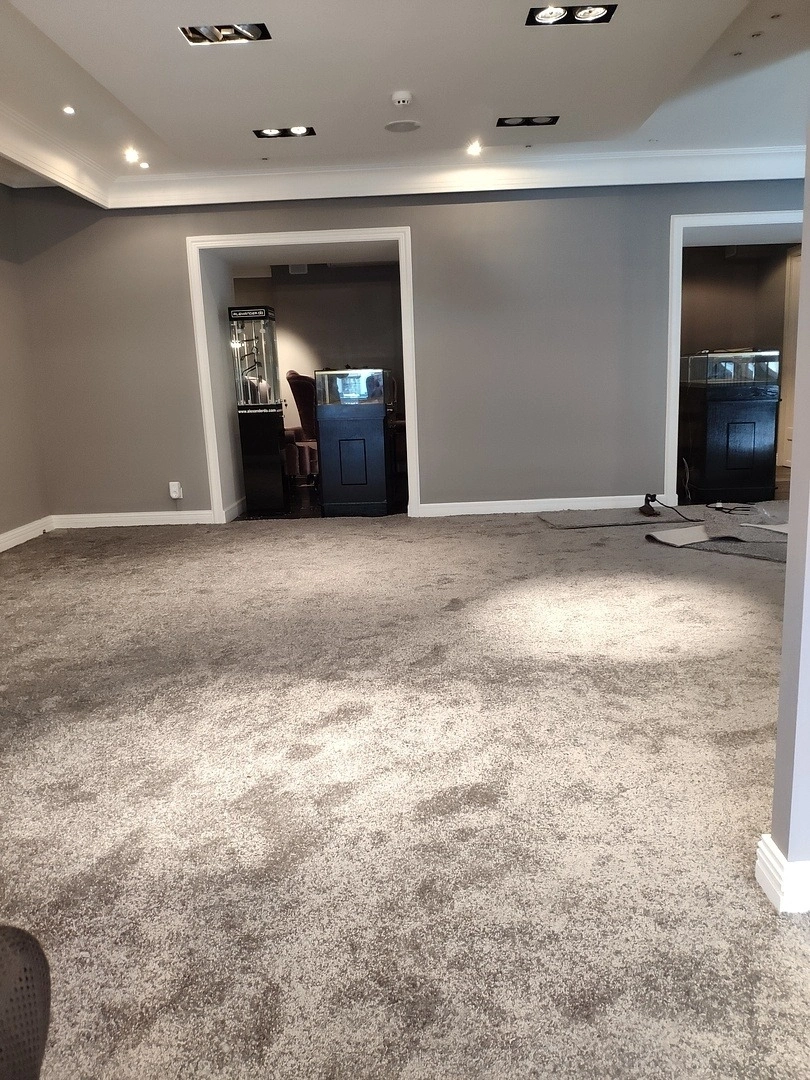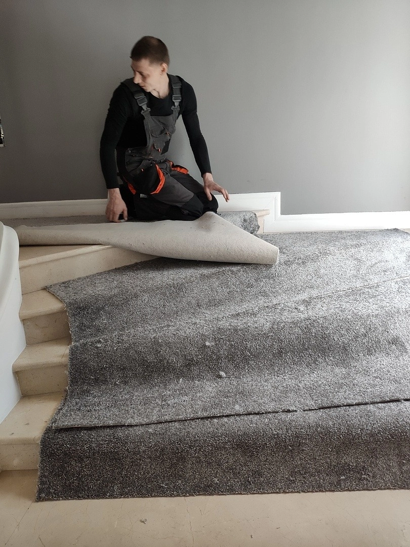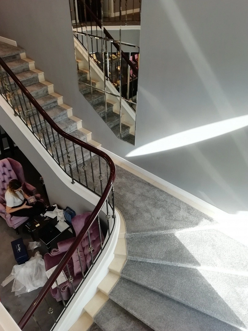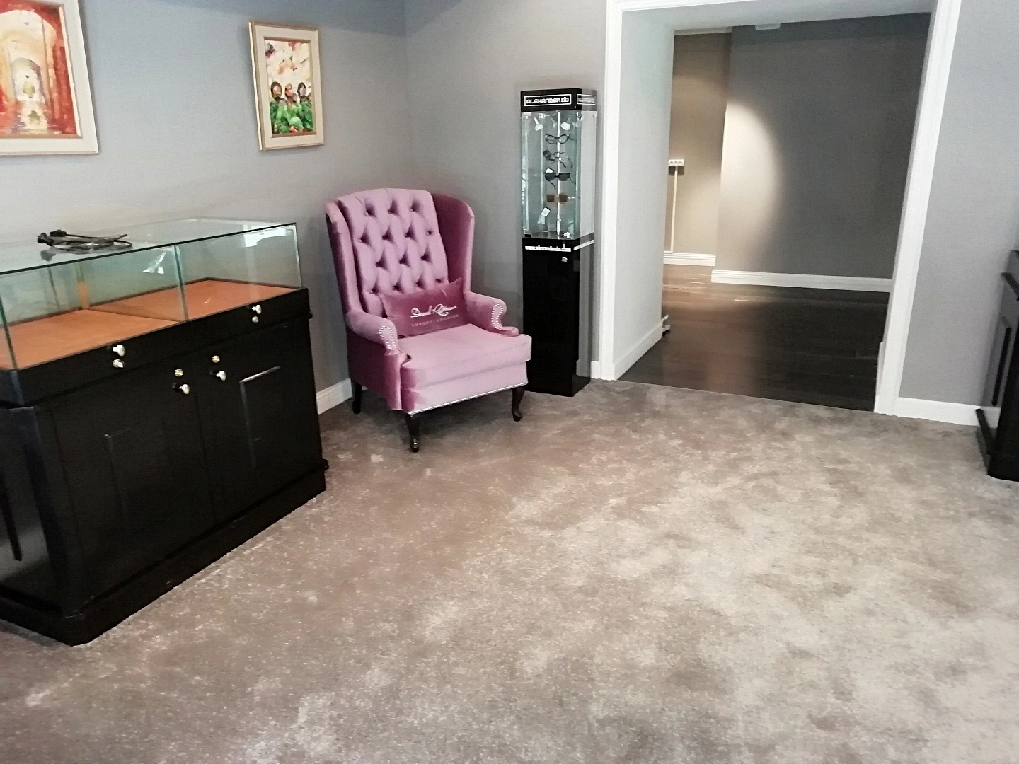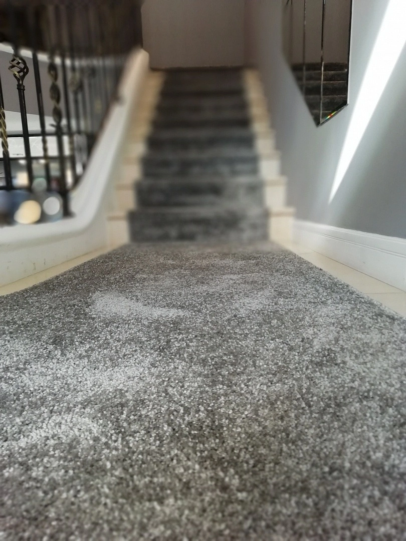 На лестнице и в клиентской зоне уложили Бельгийский ковролин . Оверлок и резку делали на месте.