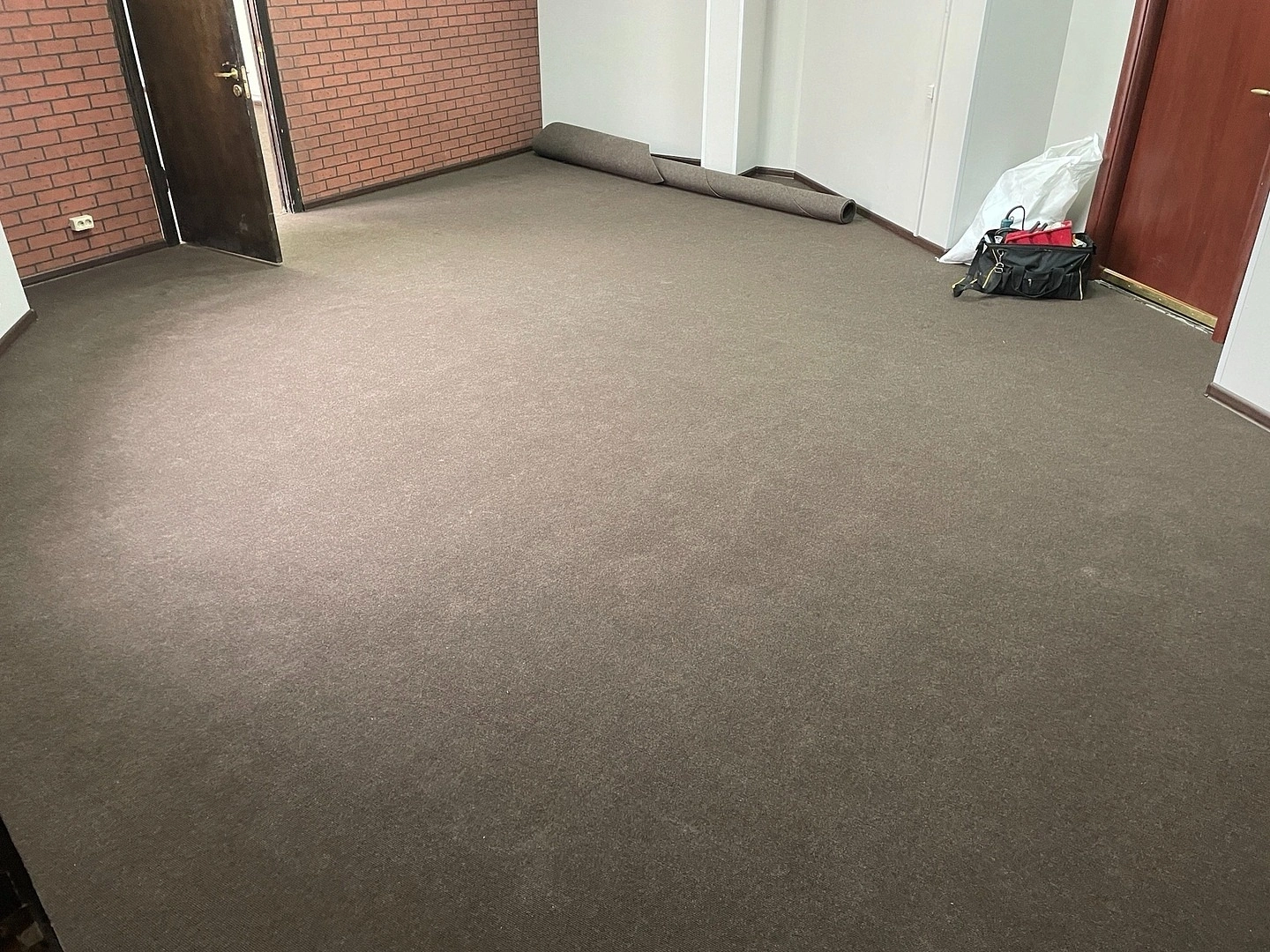 Сделали укладку ковролина в офисе. Так же установили плинтуса .