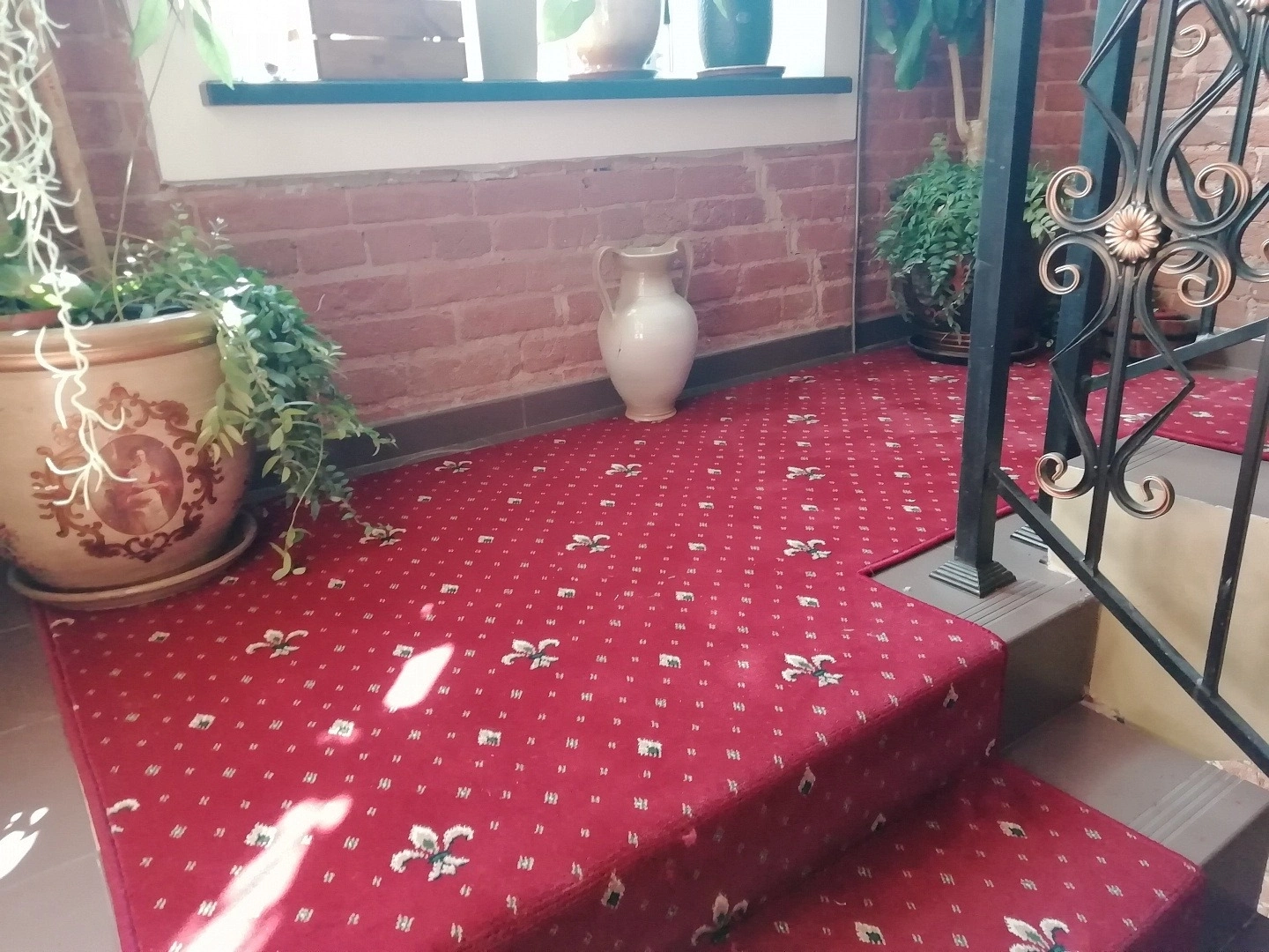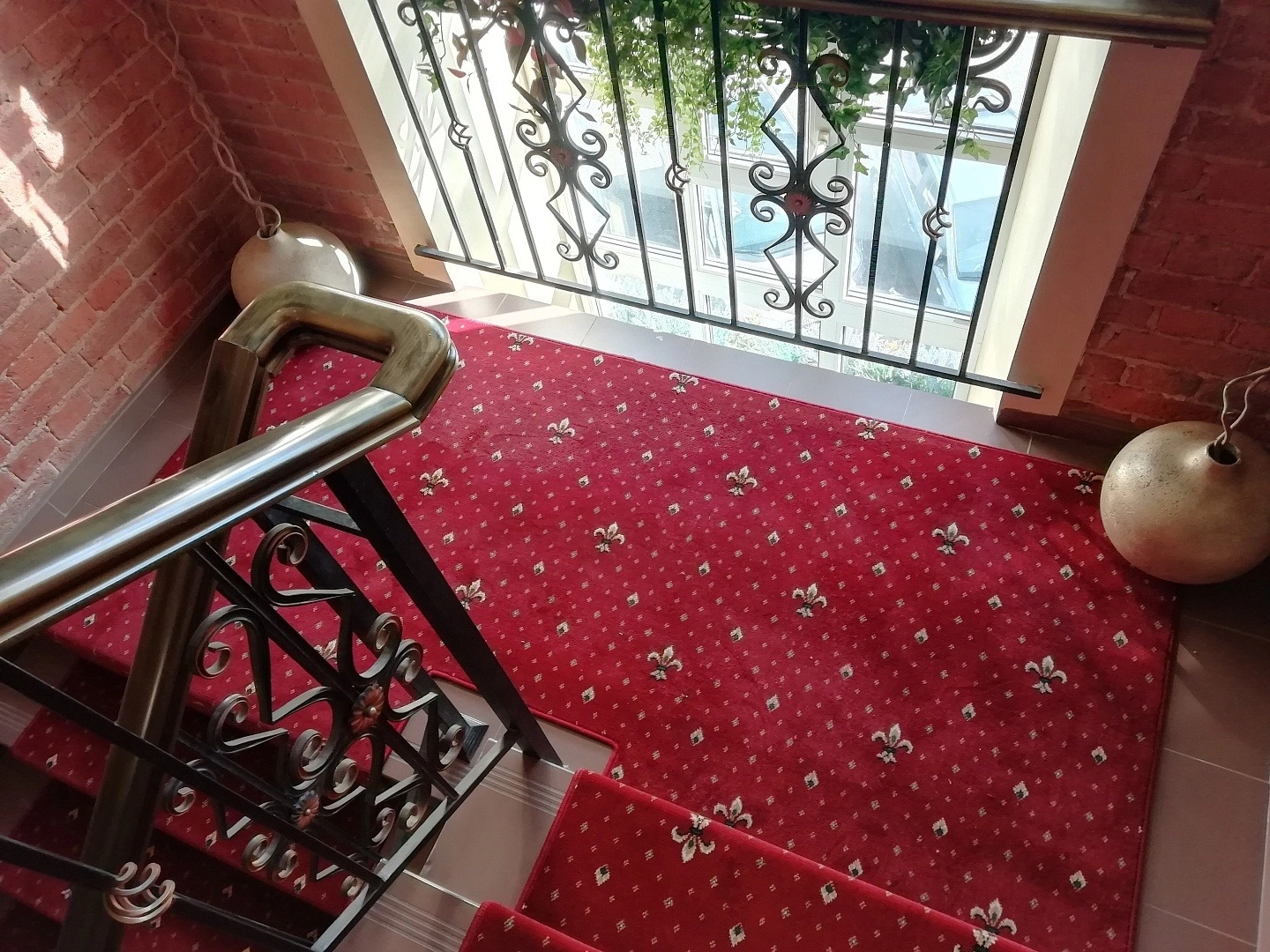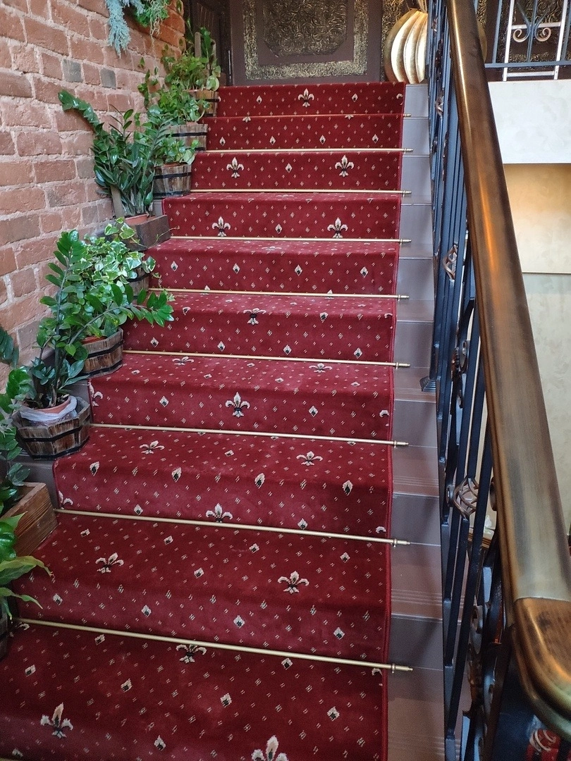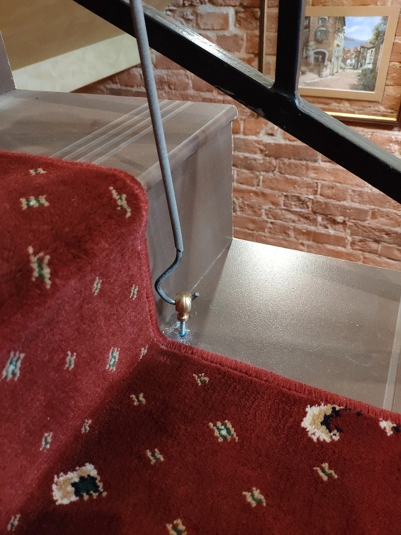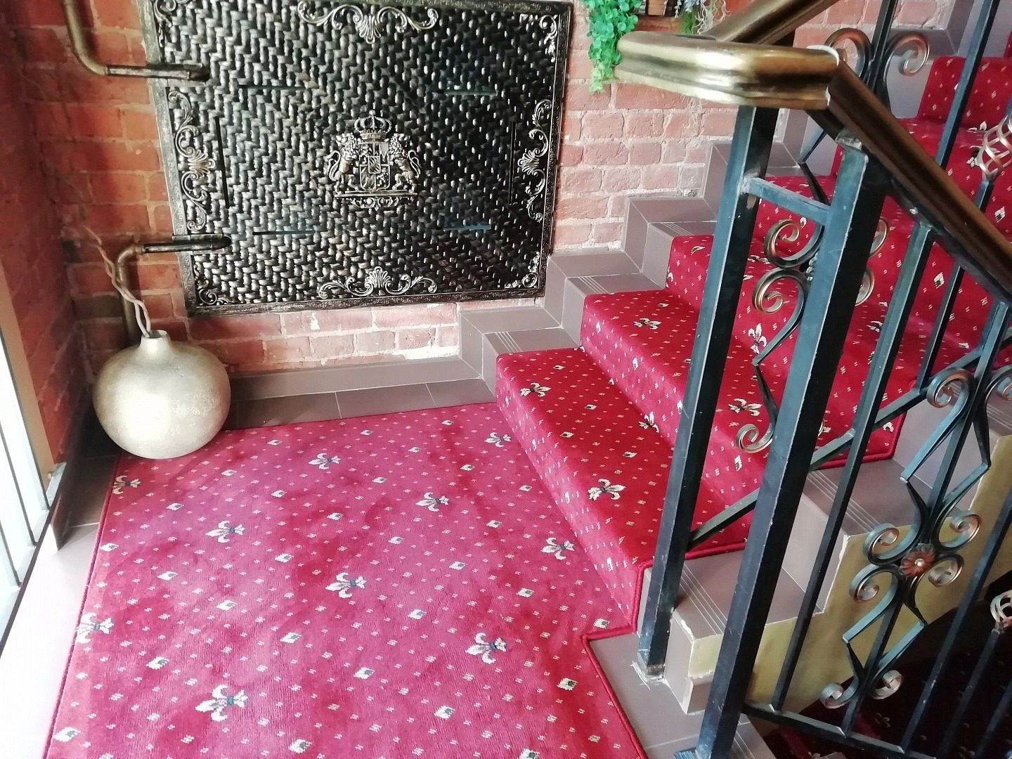 Произвели укладку качественного ковролина на двусторонний скотч. На месте сделали вырезы по размерам и оверлок.Так же по желанию клиента на ступени установили ковродержатели .