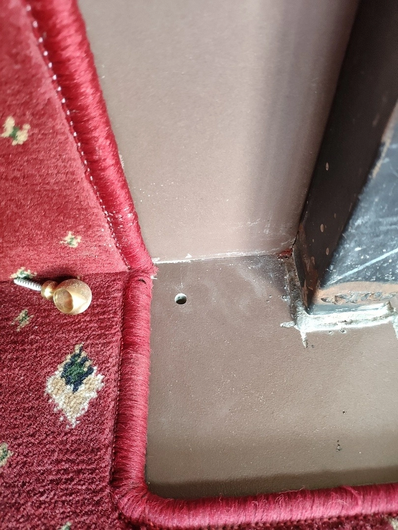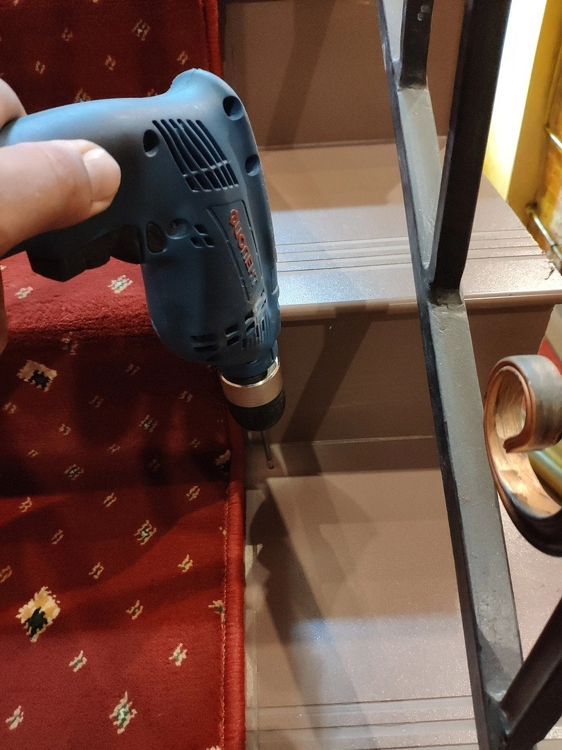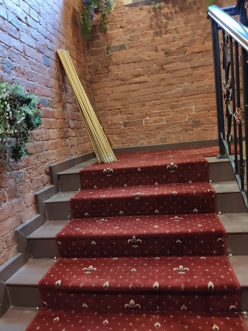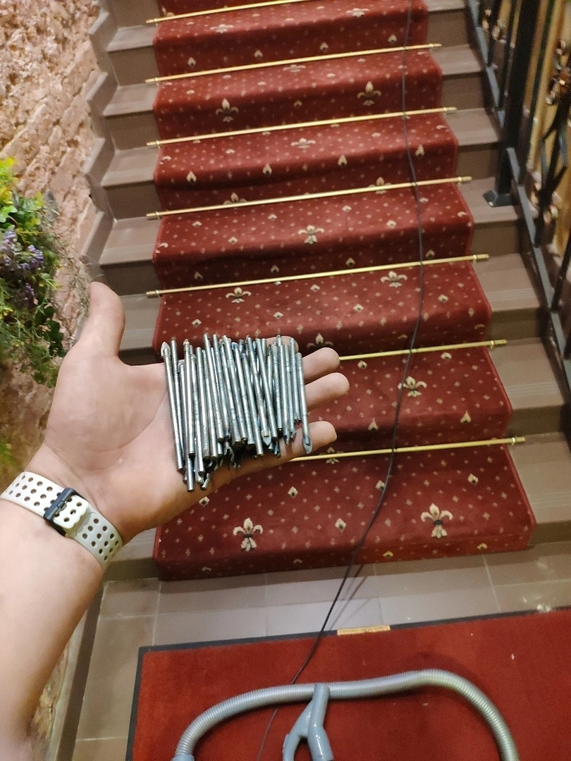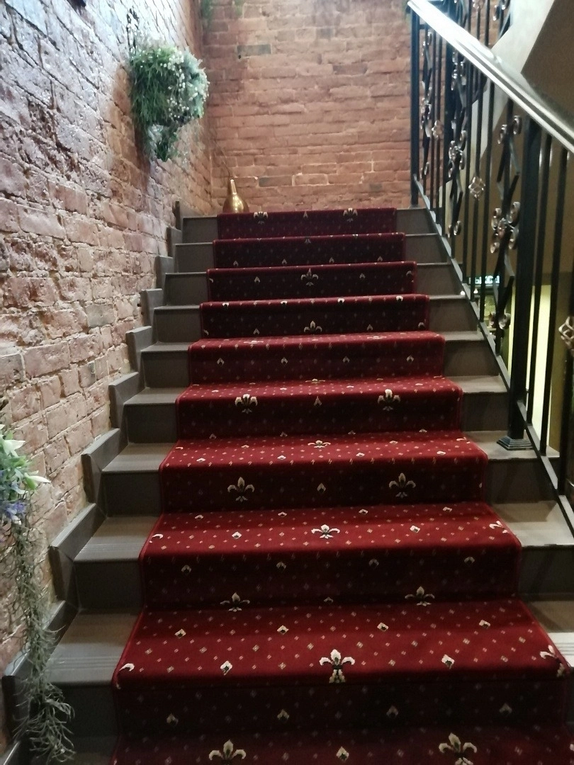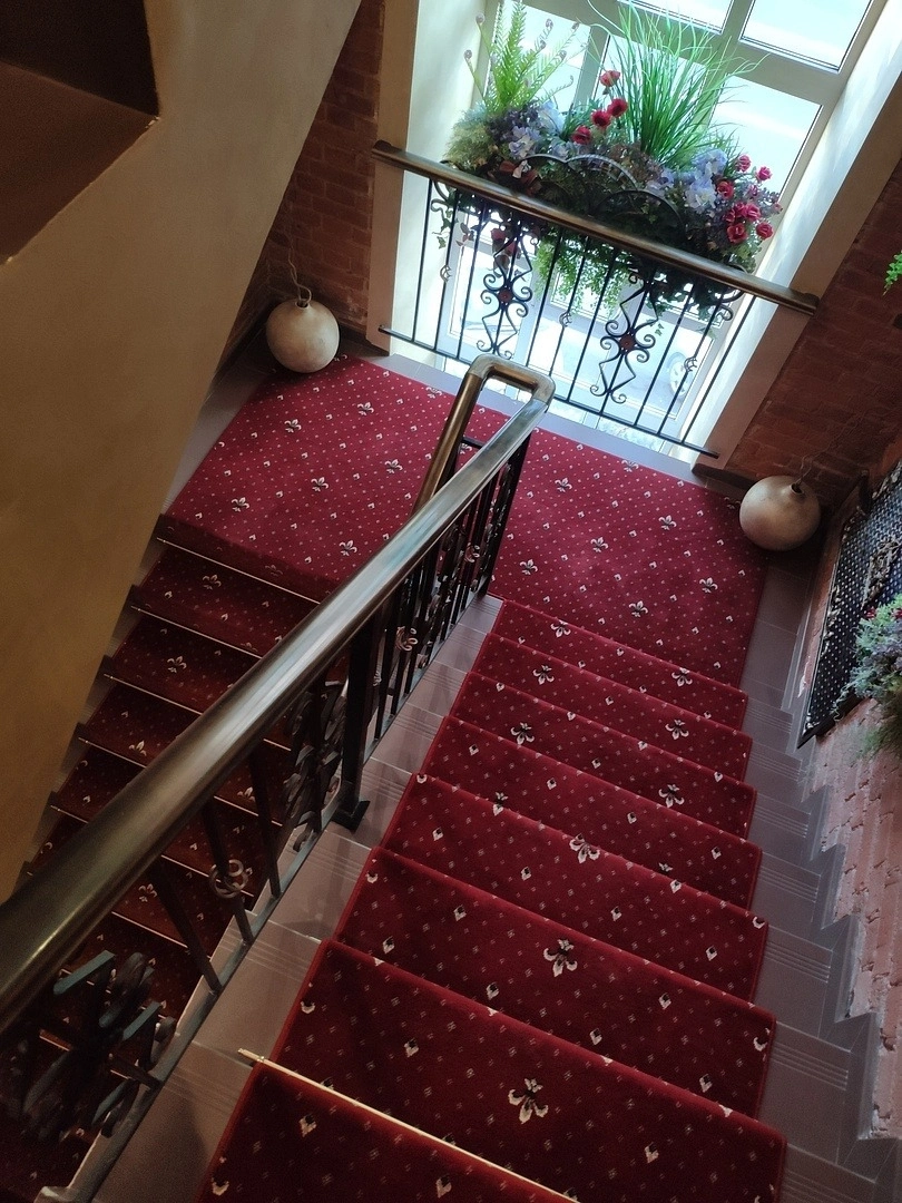 Произвели укладку качественного ковролина на двусторонний скотч. На месте сделали вырезы по размерам и оверлок.Так же по желанию клиента на ступени установили ковродержатели .