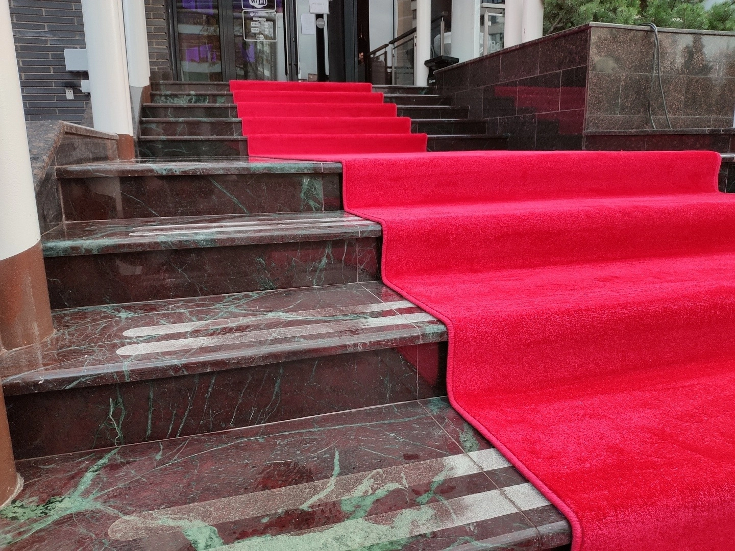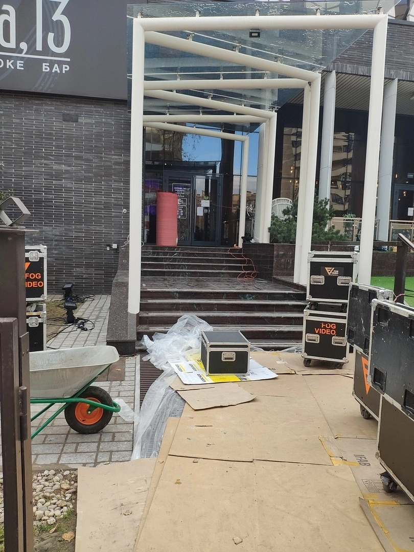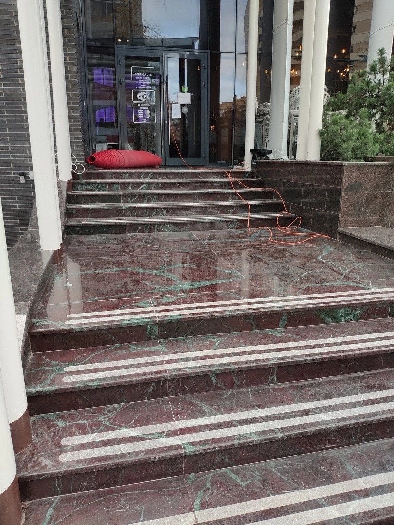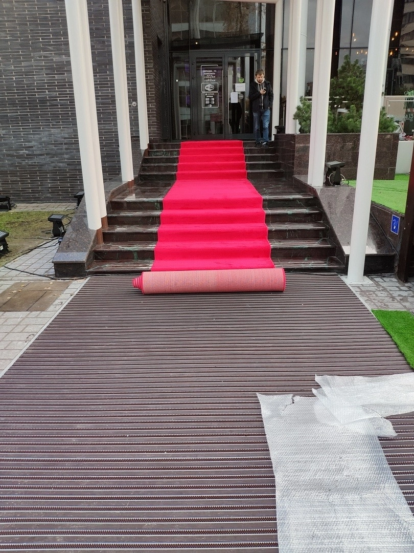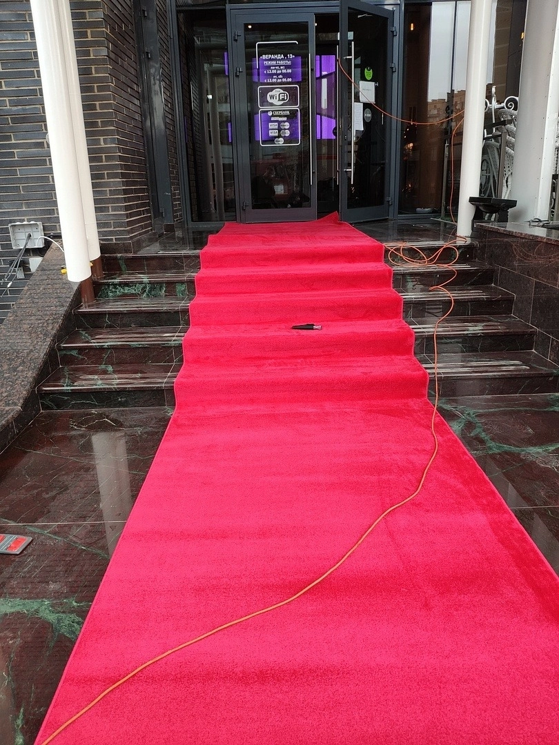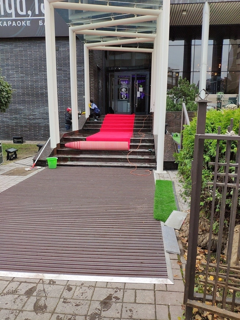 На входе в ресторан постелили дорожку для мероприятий .Укладку делали на двусторонний скотч. Предварительно провели демонтаж старого покрытия.