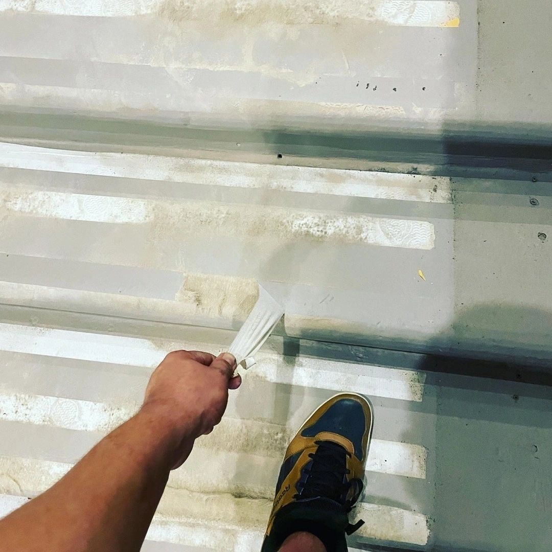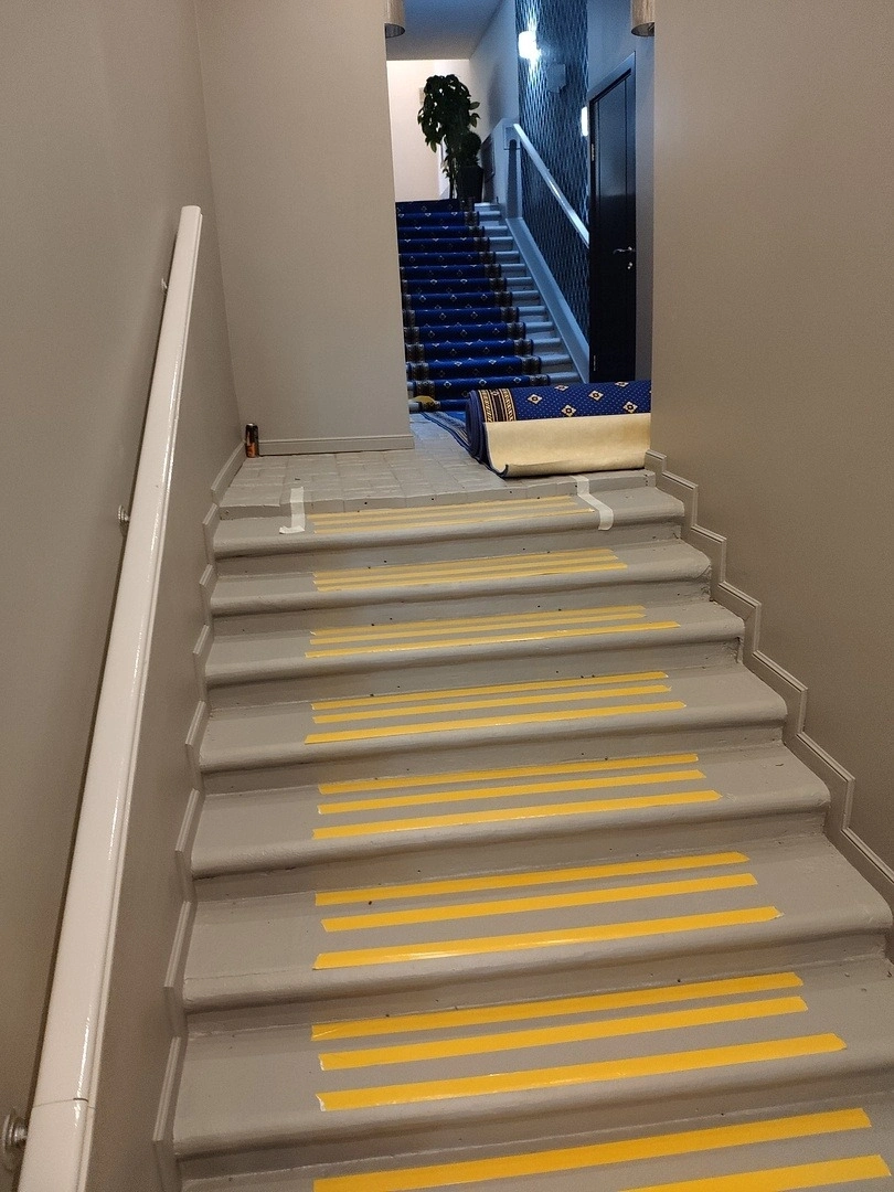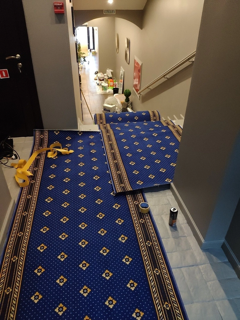 Уложили дорожку на двусторонний скотч.От входа до зала. Дорожка петлевая,на войлочной основе.